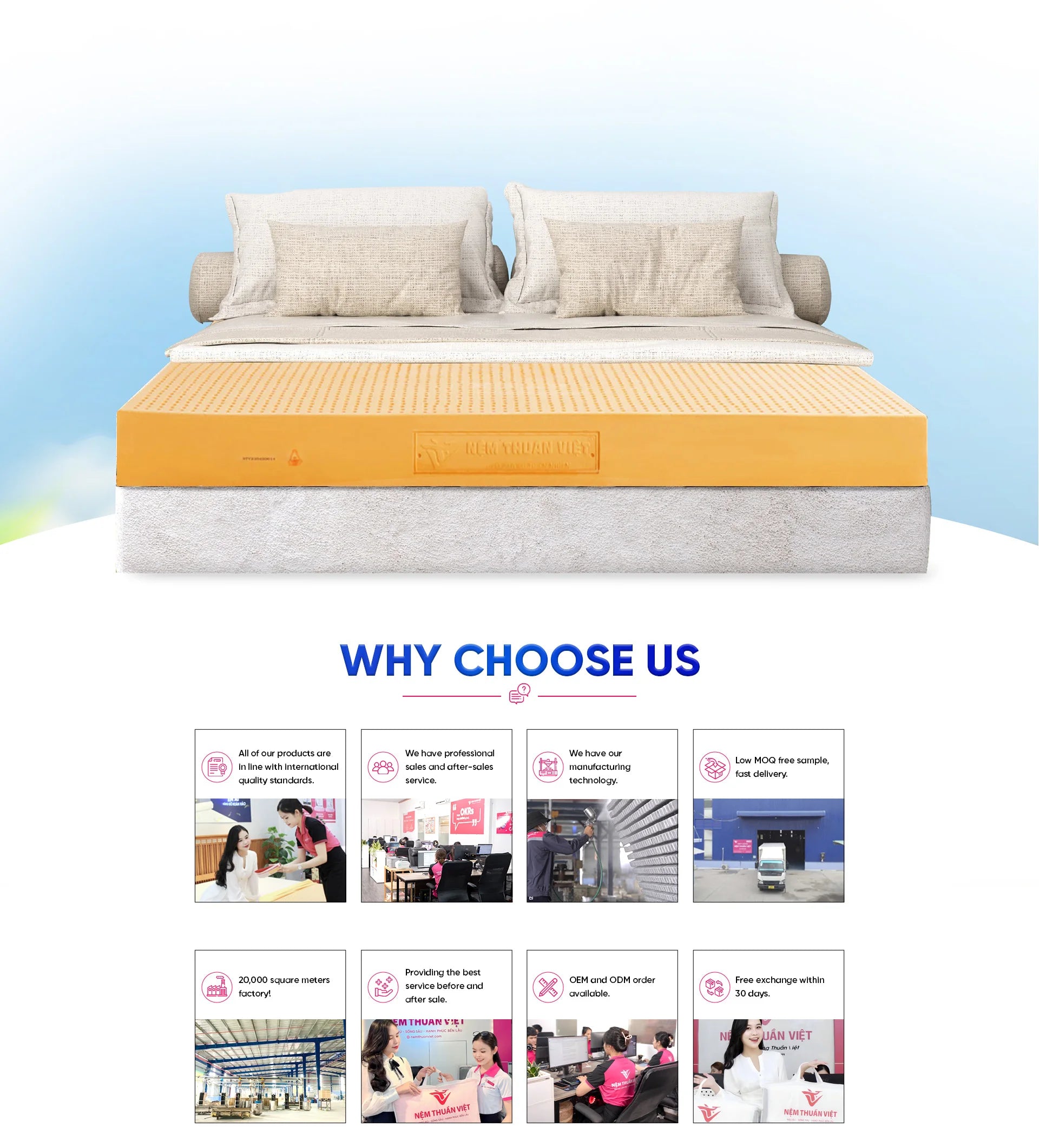 Thuan Viet Mattress Joint Stock Company is a leading and reputable brand in the field of manufacturing mattresses, pillows, and bedroom furniture. Thuan Viet Mattress builds its brand on the foundation of trust and credibility with its customers.