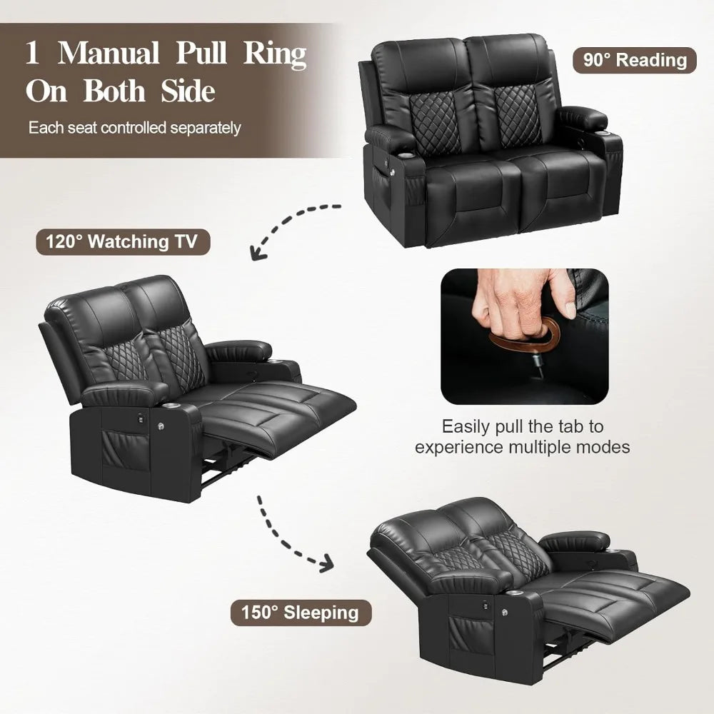 - 【Manual 2 + 1+ 1 Recliner Sofa】Smooth manual reclining function, you just need to pull the pull ring on both sides of the seat, the foot pedal of the black recliner sofa will pop up, tilting the sofa backward through the strength of your back and adjusting it to your comfortable position. When not in use, simply press the footrest with your foot and the recliner will return to its original state. The manual design will not affect the use due to power failure.