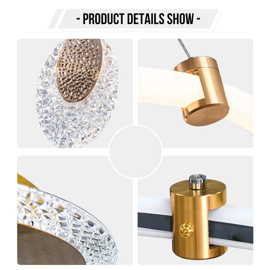 【Adjustable Three Settings & Chain】The pendant lamp creates ambient lighting due to its ring-shaped light source and hanging crystal-like elements, equipped with LED light strips inside the mounting bracket, led rings and accents, emitting in 31W/ 56W/ 87W, 3350lm/6200lm/9500lm, this chandelier is capable of illuminating a large area up to 25m²/ 35m²/ 45m², three lighting colors for settings, warm light 2700K, neutral 4500K and cool white 6500K, provides versatility in setting the tone for your desired atmosphere, included adjustable chain cords, freely customize the height tosuit your ceiling’s height and design preferences