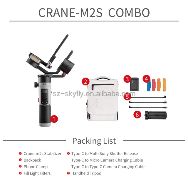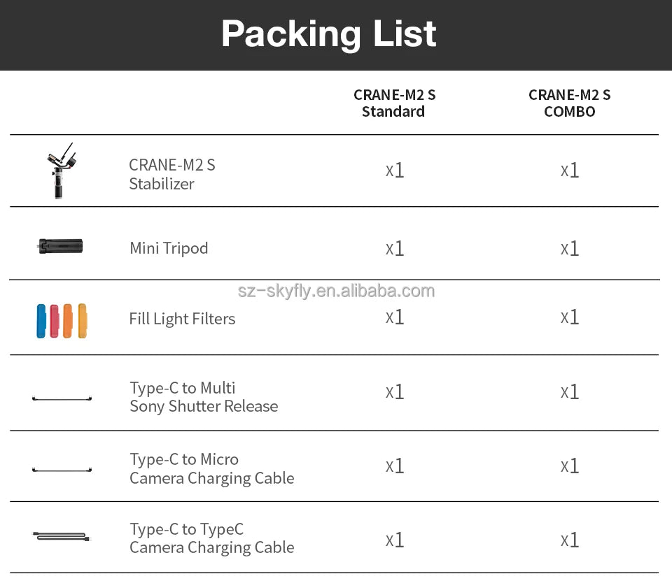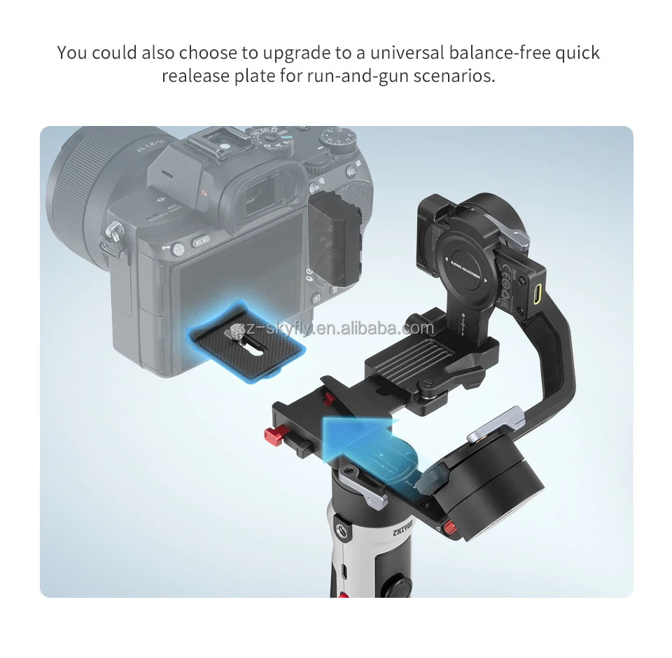 CRANE-M2S comes with the newest quick release plate that's only seen on Zhiyun flagship gimbals. It features V-shape design and