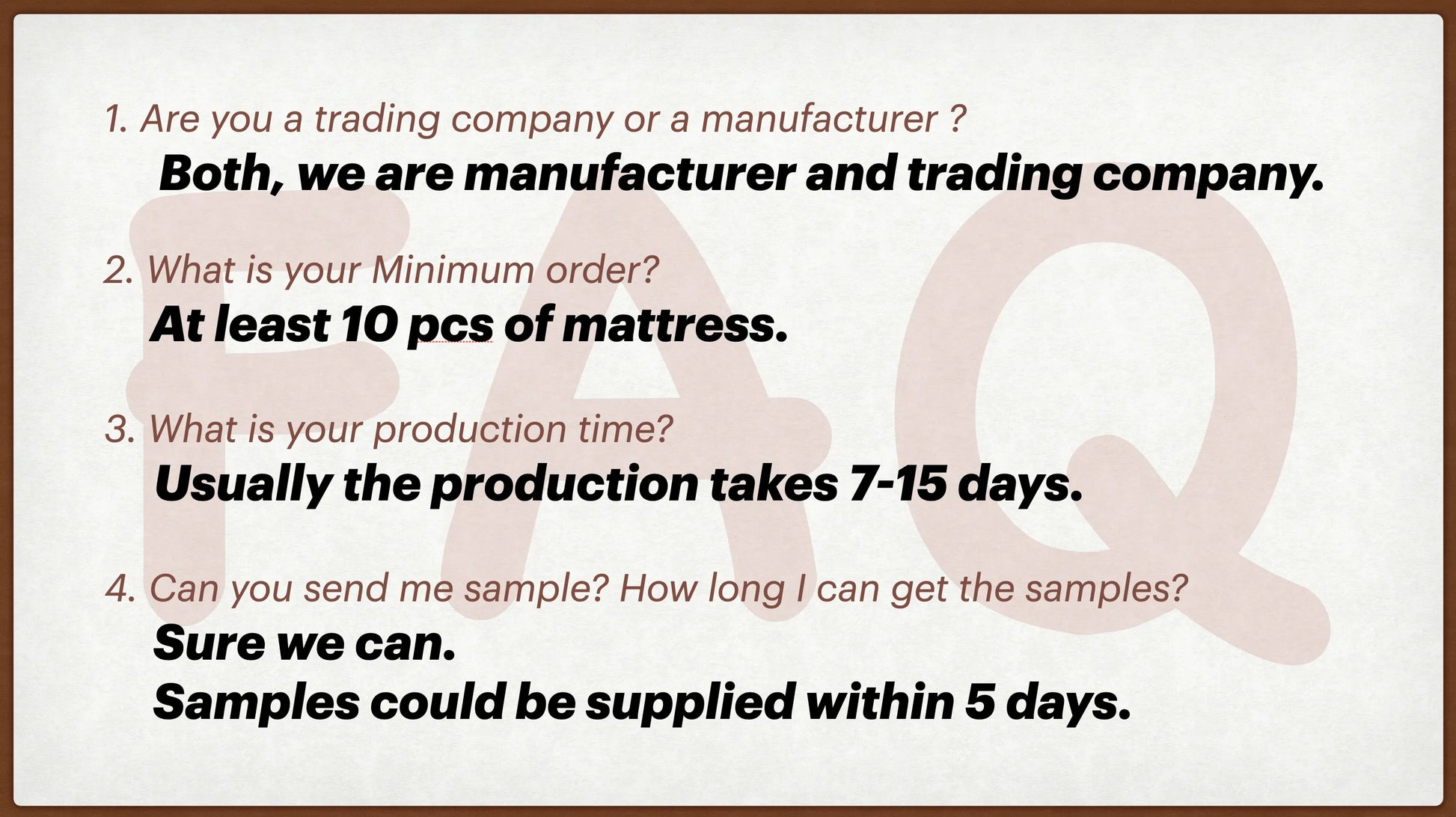 | Quantity of loading for queen size | 250pcs/20GP,500pcs/40HQ |