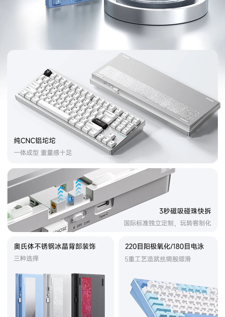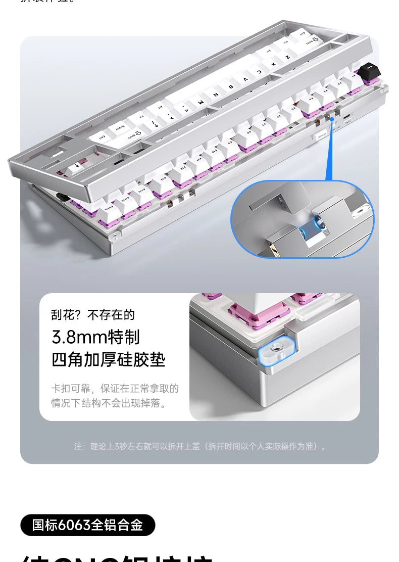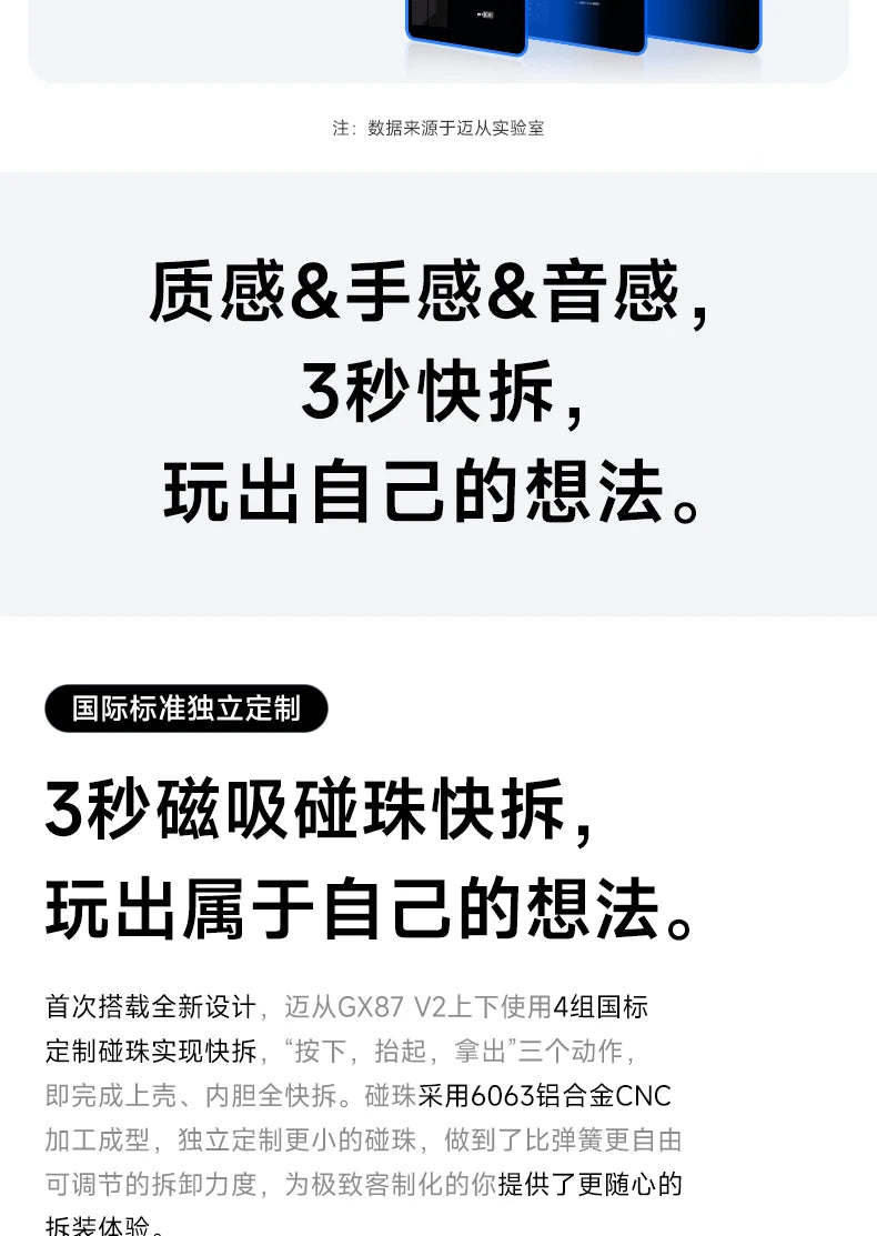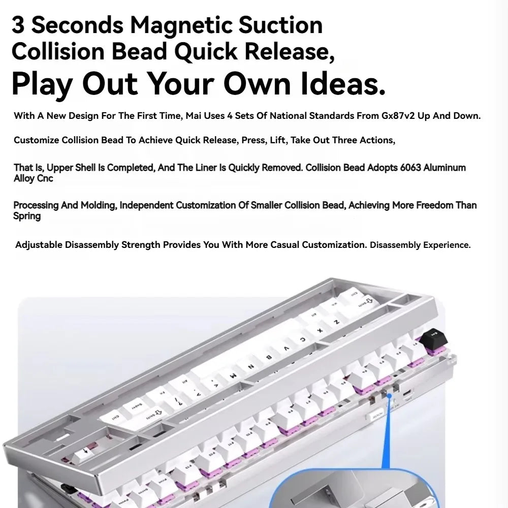1. 3 seconds magnetic touch bead quick release, play with your own ideas. For the first time equipped with a new design, Mai from the GX87 V2 up and down the use of 4 groups of national standard customized touch beads to achieve quick release, "press, lift, take out" three actions to complete the upper shell, the inner liner full quick release. The touch beads are CNC machined from 6063 aluminum alloy, and the smaller independent customized touch beads provide a more freely adjustable disassembly strength than springs, providing a more casual disassembly experience for the ultimate customized you!