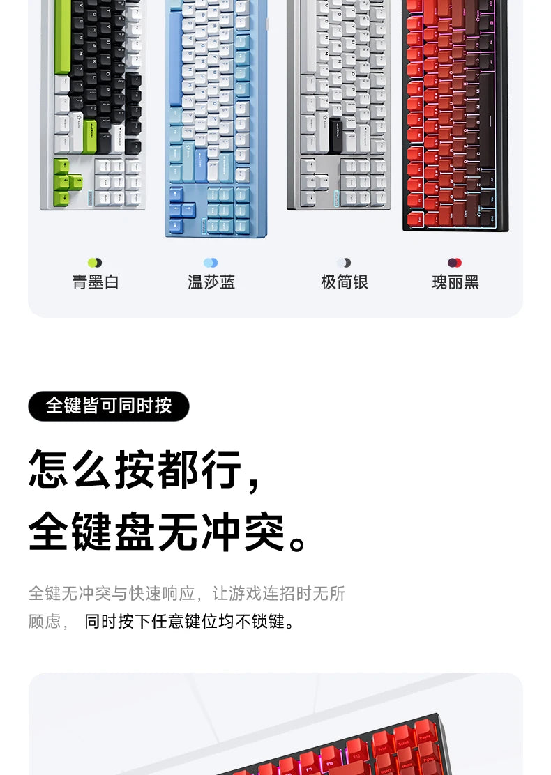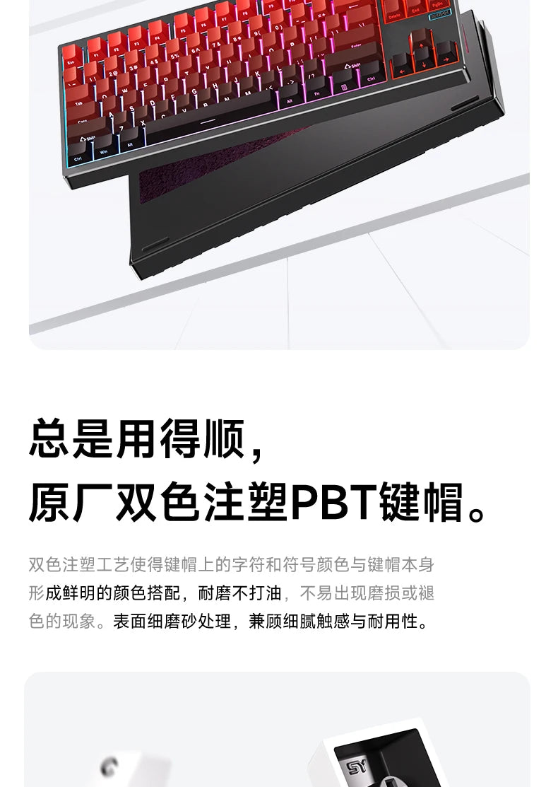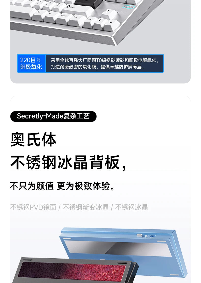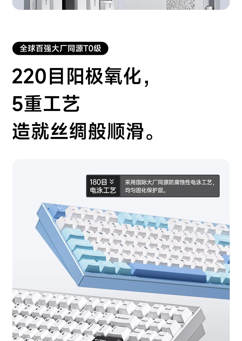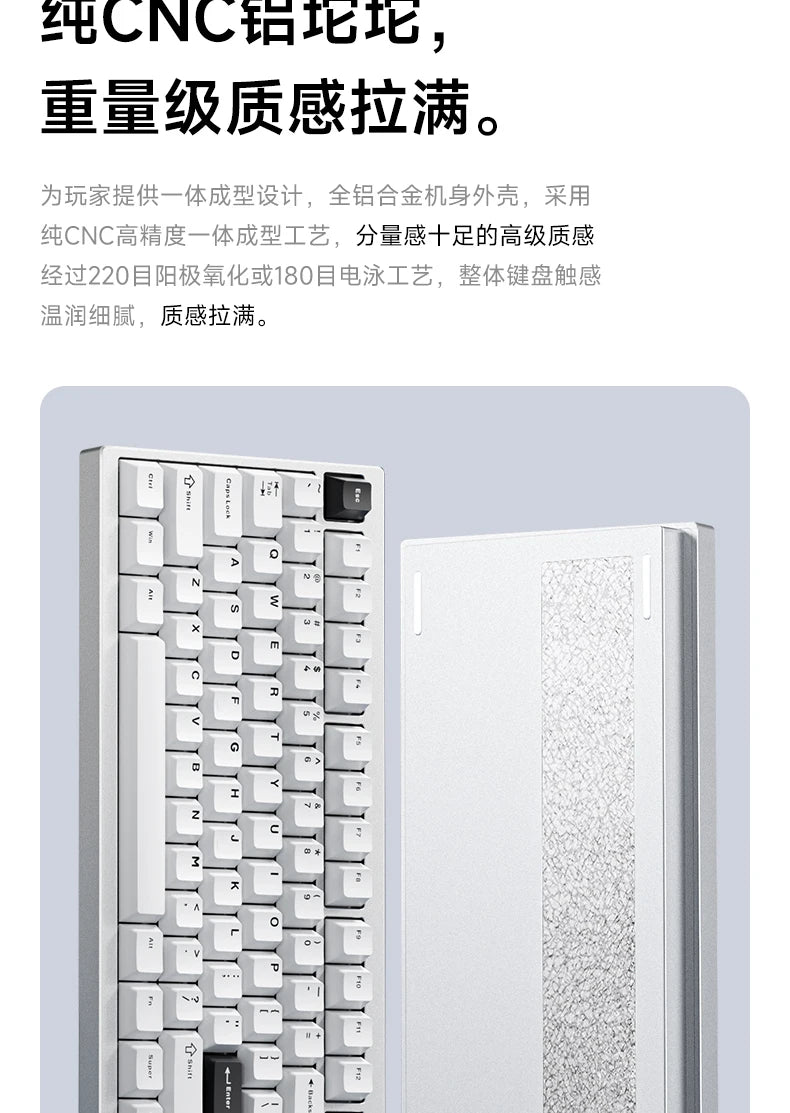2. Pure CNC aluminum Tuotuo heavyweight texture is full to provide players with an integrated design. The all-aluminum fuselage shell adopts pure CNC high-precision integrated molding process, and the high-grade texture with full weight is anodized by 220 mesh or electrophoretic by 180 mesh. The overall keyboard feels warm and delicate, and the texture is full.