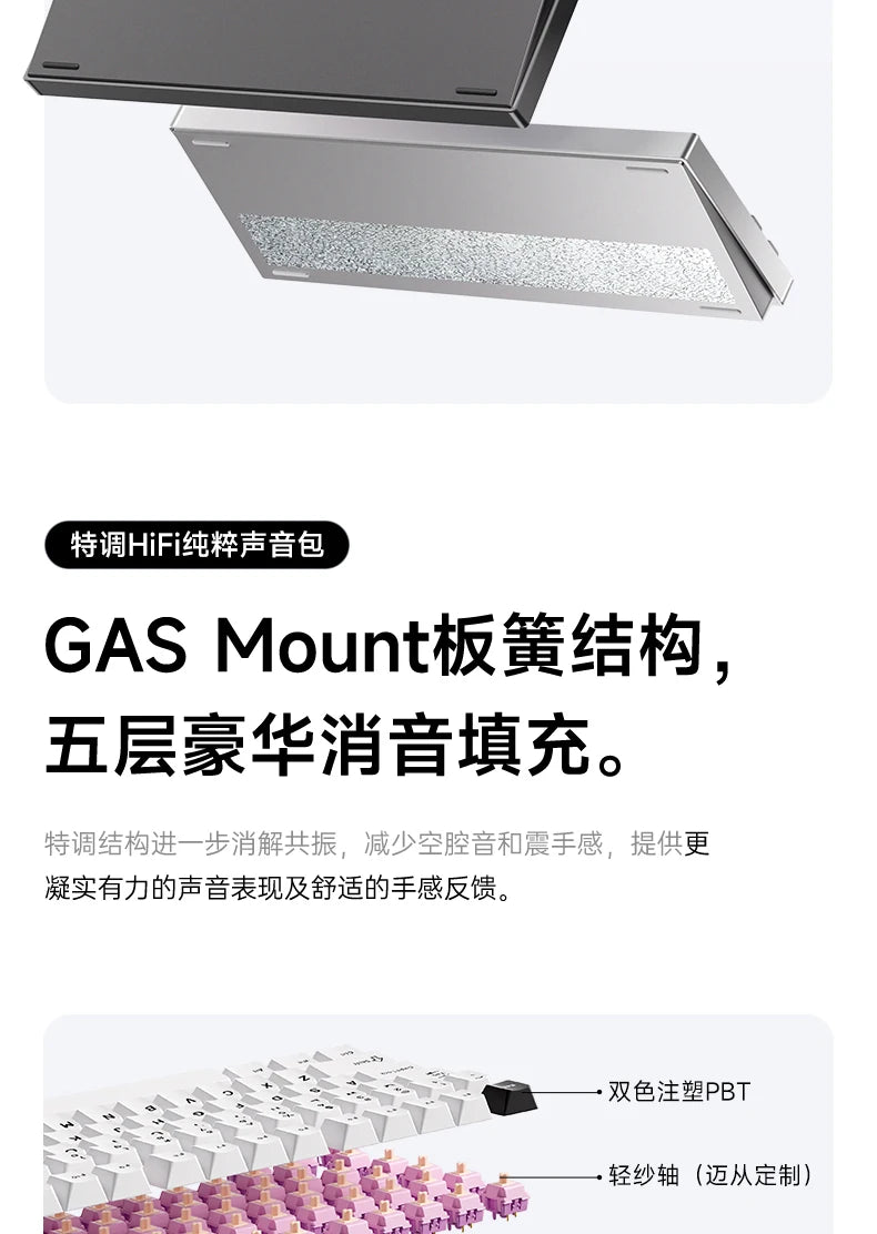 5. Specially tuned HiFi pure sound package GAS Mount leaf spring structure with five layers of luxurious silencing filling. The specially tuned structure further eliminates resonance, reduces cavity sound and shock feel, and provides more solid and powerful sound performance and comfortable feel feedback.