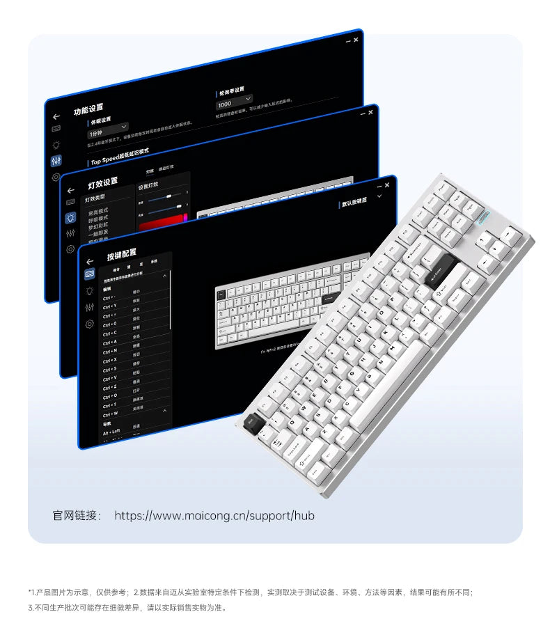 Maicong's exclusive driver supports on-board storage, official website can be quickly installed with one button, and all-key functions can be customized. Keyboard performance parameters and RGB lighting effects can be set to meet the diverse needs of gameplay.