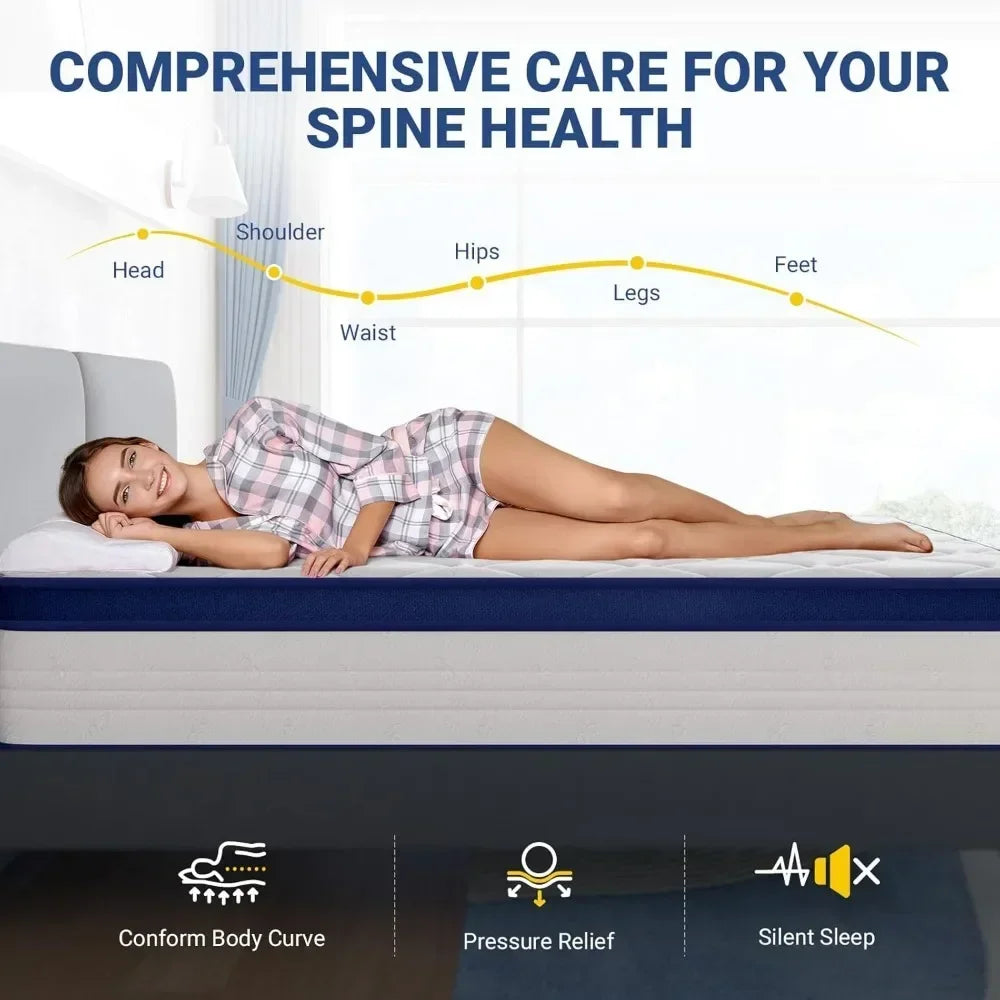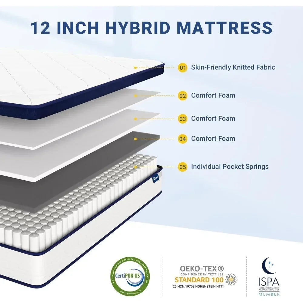 - 【Pressure Release And Comfortable Sleep】The 12-inch full-size mattress is designed with spring-wrapped individual pocket springs to provide optimal support while minimizing the risk of sagging or collapsing, effectively maintaining the natural curvature of the spine. The coil system facilitates air circulation, preventing the build-up of excess heat and ensuring a cooler, drier surface for a more comfortable sleeping experience.