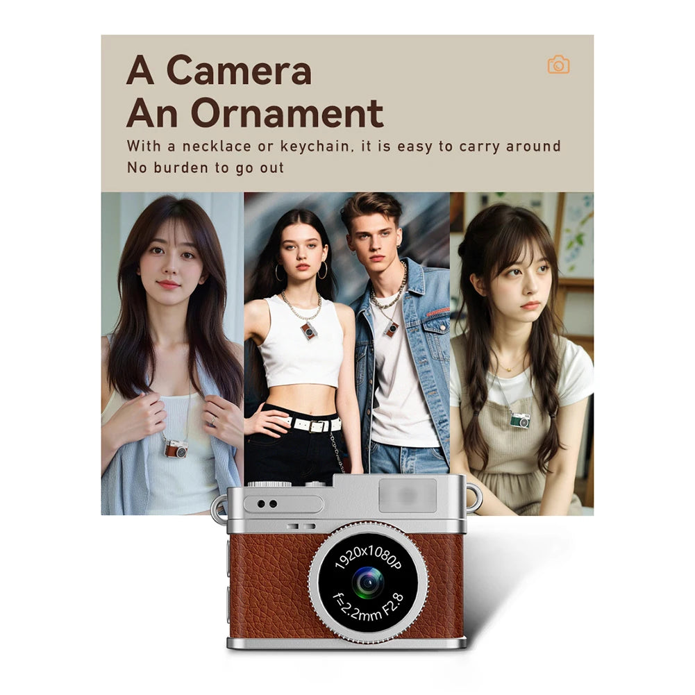 Features: 1.Classic Retro Design: The leather texture combined with silver metal edges presents a retro digital camera aesthetic, defining a unique style just for you. 2.Camera and Accessory in One: This mini camera serves as both a video recorder and an accessory, easily worn with a chain or keychain for effortless portability. 3.0.96-Inch IPS Color Screen: Featuring a 0.96-inch IPS color screen, this portable small camera offers clear imagery that is gentle on the eyes, allowing real-time preview and selection. 4.Built-In LED Fill Light: Even in dim lighting conditions, the tiny camera's built-in LED fill light provides sufficient illumination, ensuring high-quality visuals. 5.Built-In Lithium Battery: With a built-in 180mAh lithium battery, enjoy 50 minutes of video recording or 120 minutes of continuous shooting by connecting to a phone, power bank, tablet, or computer. Specification: Origin: Mainland China Video resolution: 1080P 30FPS Circle recording: 3 minutes by default Recording function: Supported Video format: AVI Storage compression: H.264 Camera angle: 70° Display: 0.96-inch IPS color screen Battery: Built-in 3.7V/180mAH lithium battery Expanded memory: MAX 128G Photographing: Yes Image resolution: 2M by default Image format: JPG Data connection: Type-C 5pin USB Body weight: 17.5g Body size: 44*27*23mm/1.73x1.06x0.91inch
