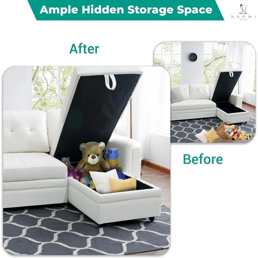 Our sectional sofa features a generously sized chaise with built-in storage, providing ample space to conveniently store extra pillows, blankets, and other essentials, ensuring a clutter-free living area.
