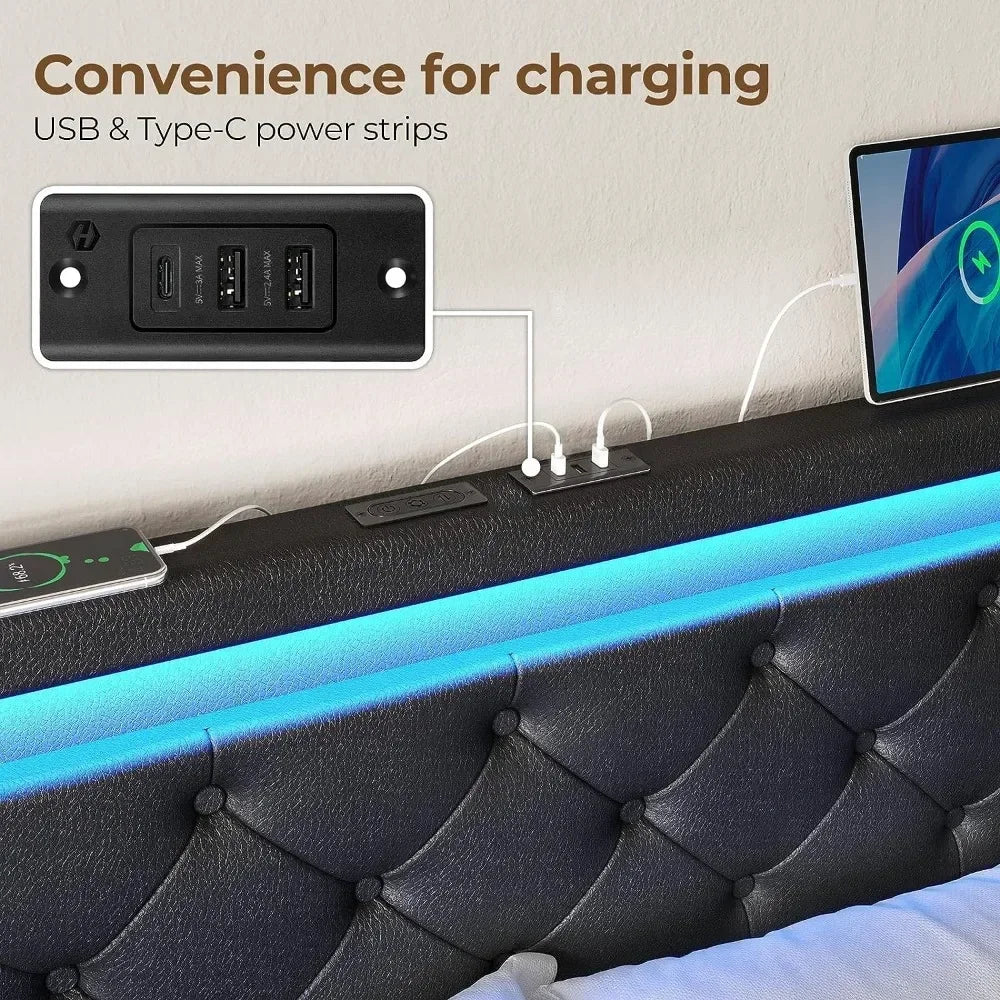 bed frame boasts built-in LED lighting on the headboard and footboard with 7 main colors, 12 scene modes, 3 speed levels adjustments, and 3 brightness modes to create a stunning ambiance. The controller is installed on the headboard, convenient to change the light when you need it.