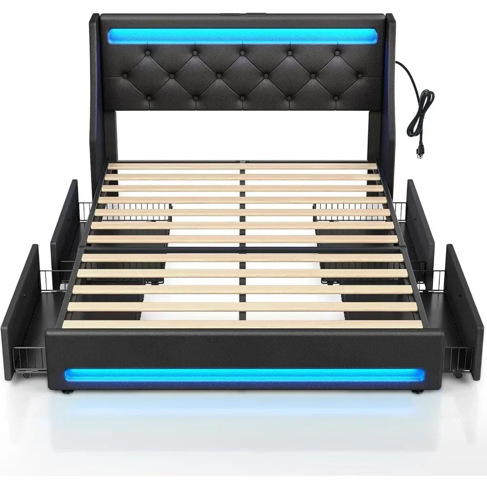 Twin bed frame with LED lights and charging station, upholstered bed with drawers, wooden planks, noiseless and easy to assemble
