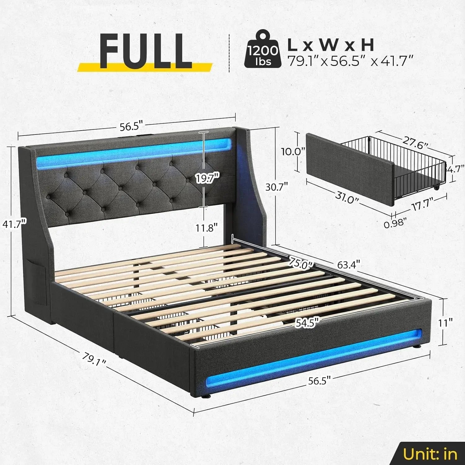 The bed has four large capacity sliding drawers that offer ample place to collect sheets, accessories, and off-season clothing. The double pocket of the wingback is convenient to keep your remote, magazines, or any small things.