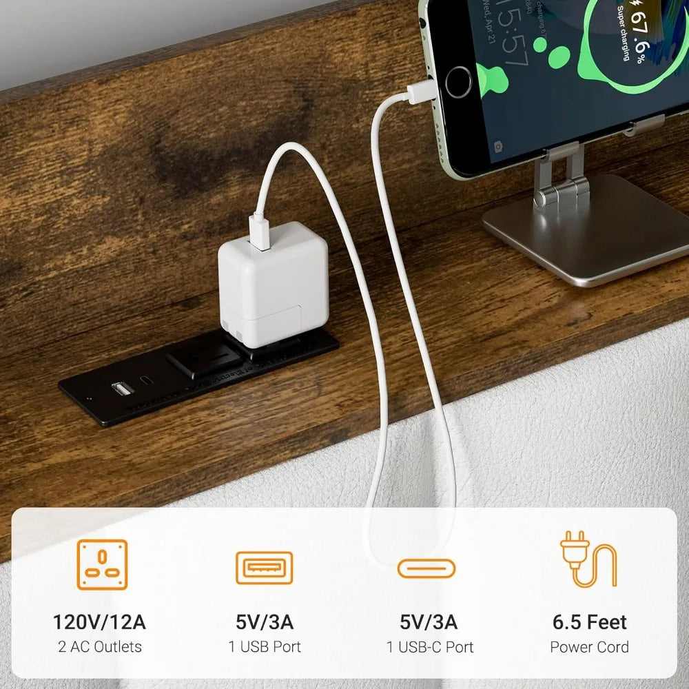 Storage Headboard with Charging Station: Built-in 2 standard plug sockets, 1 USB-C and USB port. The King size bed frame with storage shelves in the headboard provides extra storage space for the items you need while bedtime.