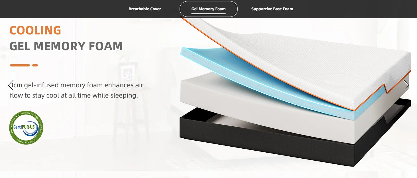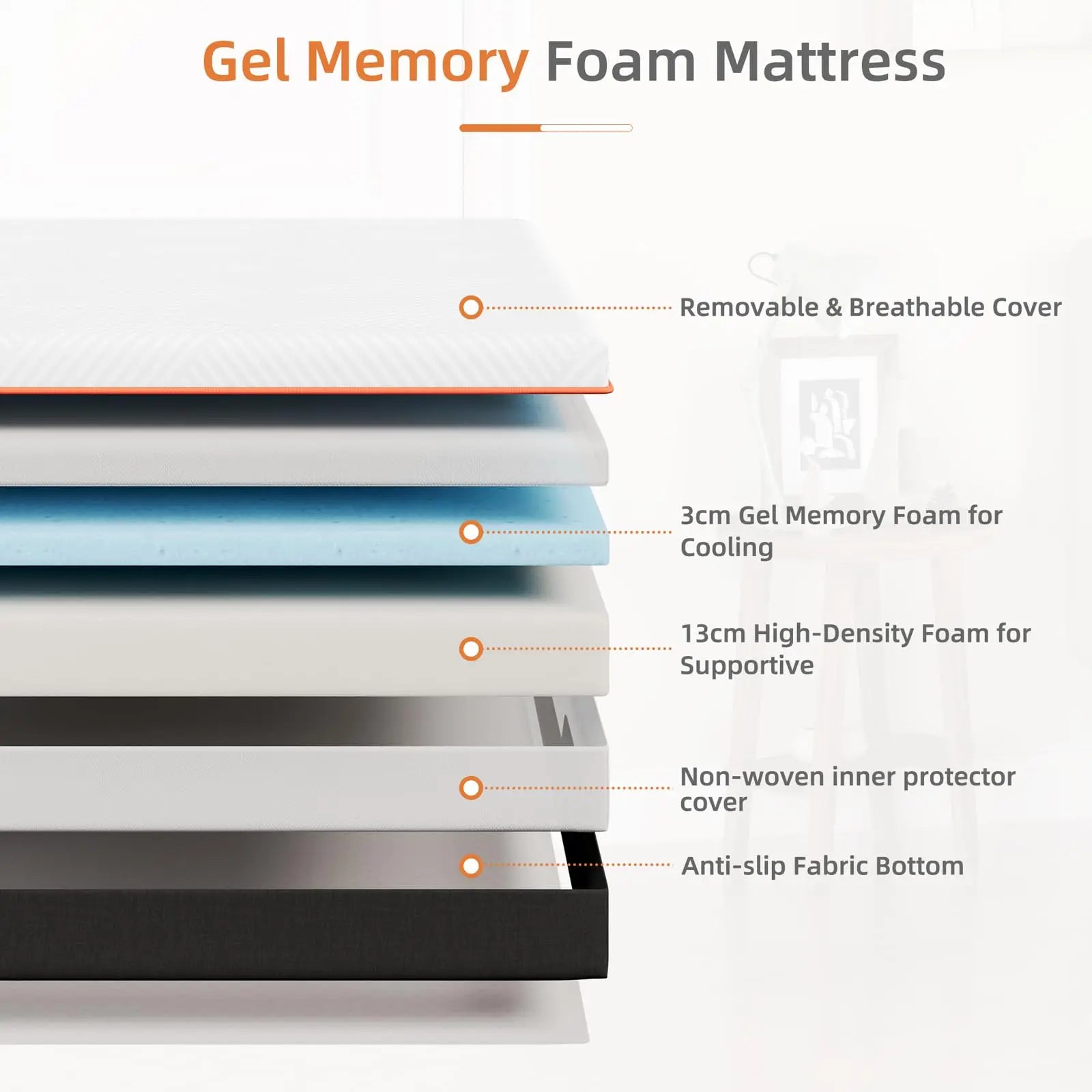 1.MEMORY FOAM MATTRESS: This 16cm memory foam mattress features a 2-layer design that includes 3cm cooling gel memory foam and 13cm supportive base foam. The foam on top is a gel-infused memory foam that can effectively relieve your body pressure, and give you a cooling and cloud-like sleep experience; The high density base foam gives your body perfect support from head to toe and resists sagging