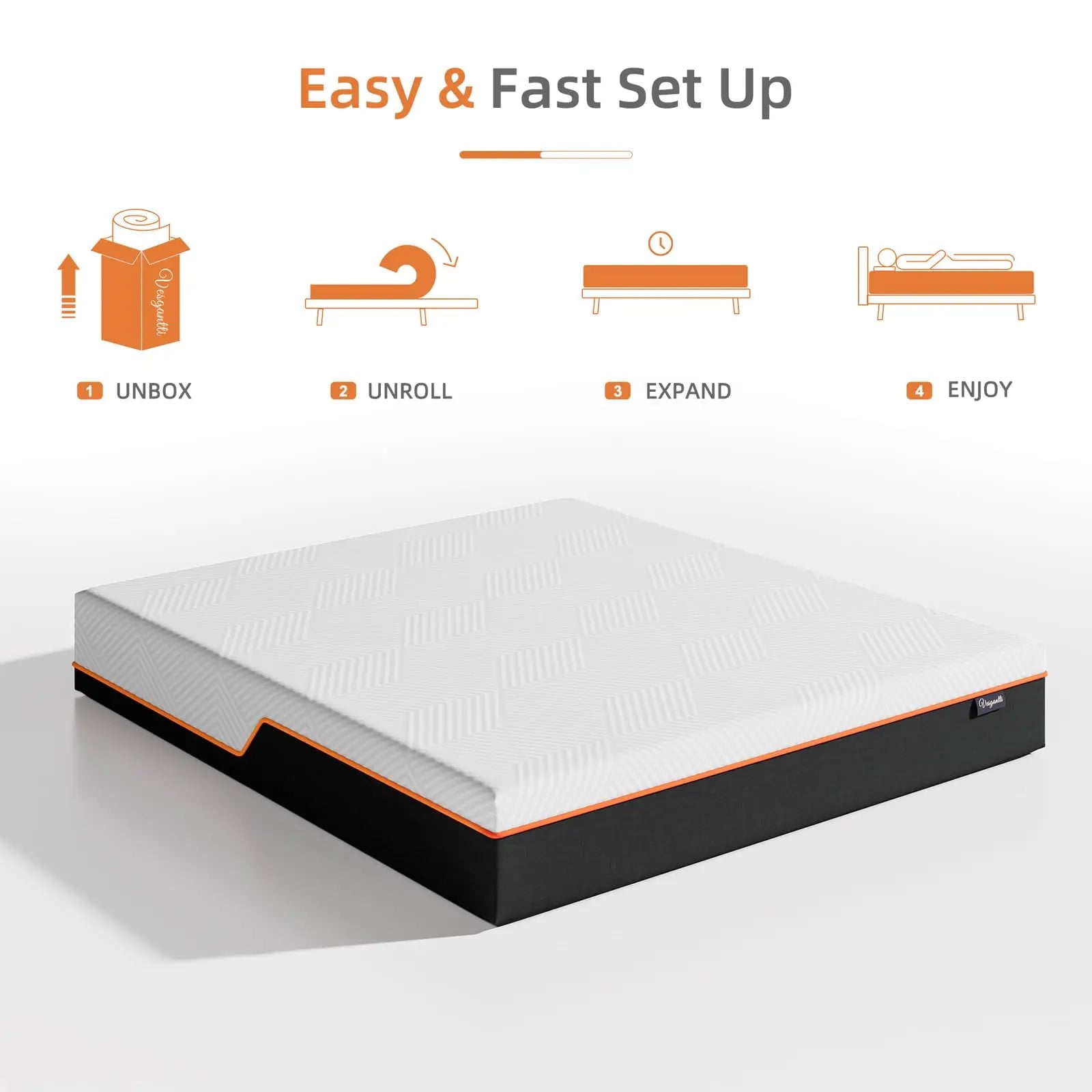 4.MATTRESS-IN-A-BOX: This mattress is compressed rolled, and you can easily move it and set it up in your room. It will inflate right after unpacking, but please allow 24-48 hours for it to fully expand. (Any memory foam will expand faster in a warmer room. In cold temperatures, your mattress may take a bit longer to return to full size)