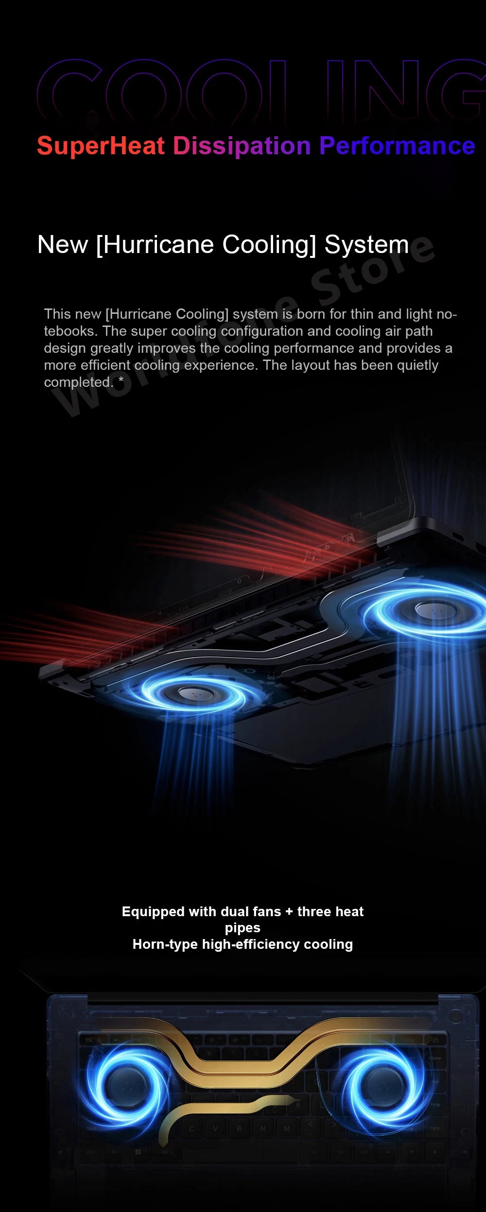 This new [Hurricane Cooling] system is born for thin and light notebooks.The super cooling configuration and cooling air pathdesign greatly improves the cooling performance and provides amore efficient cooling experience.The layout has been quietlycompleted.*