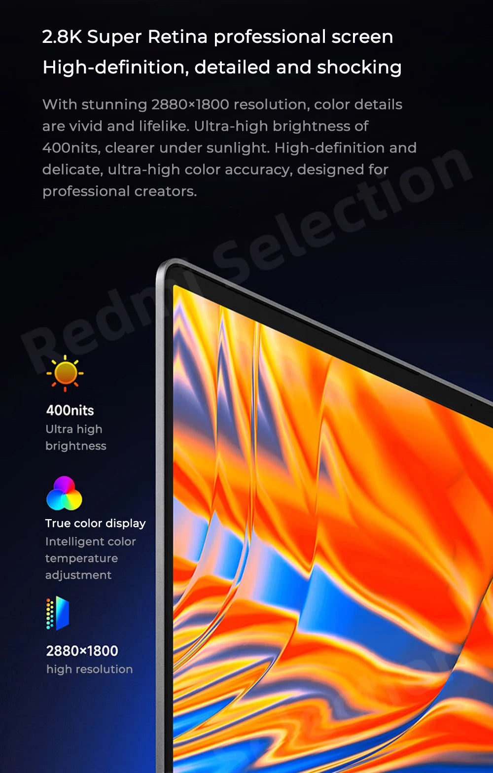 With stunning 2880x 1800 resolution, color details are vivid and lifelike. Ultra-high brightness of 400nits, clearer under sunlight. High-definition and delicate, ultra-high color accuracy, designed for professional creators.