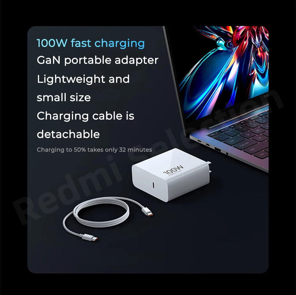 Fast Charging: With the standard 100W GaN adapter, the laptop can be charged to 50% < = 32 minutes when the laptop is powered off at room temperature (25 degrees Celsius) without any additional devices