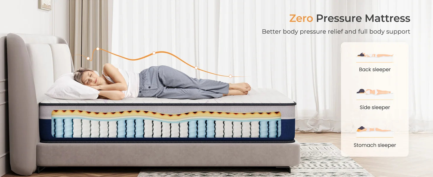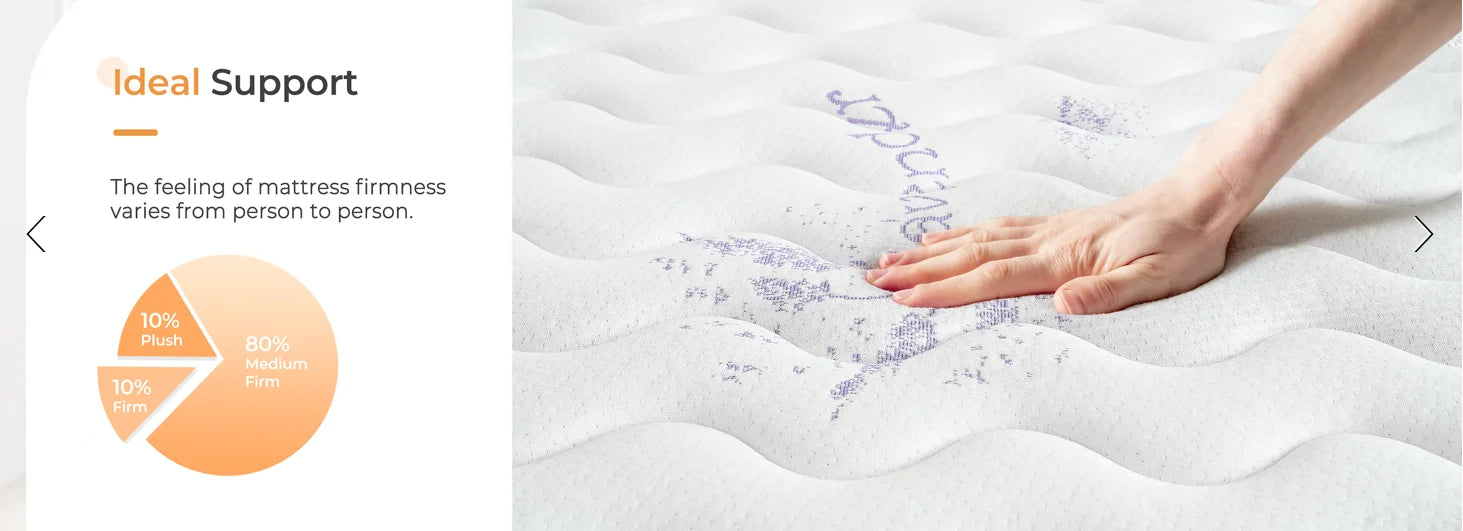 2.Medium Firm Feel: Designed with layers of CertiPUR-US certified foam and hundreds of individual pocket springs, the mattress is soft enough to be comfortable yet firm enough to be supportive. An ultra-quiet hybrid mattress for side, back and stomach sleepers