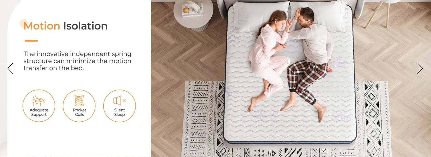 3.Motion Isolation: Excellent shock-absorption and resilience, can effectively absorb noise and vibration caused by tossing and turning. You and your partner both dream sweet dreams, and will not be awakened by noise