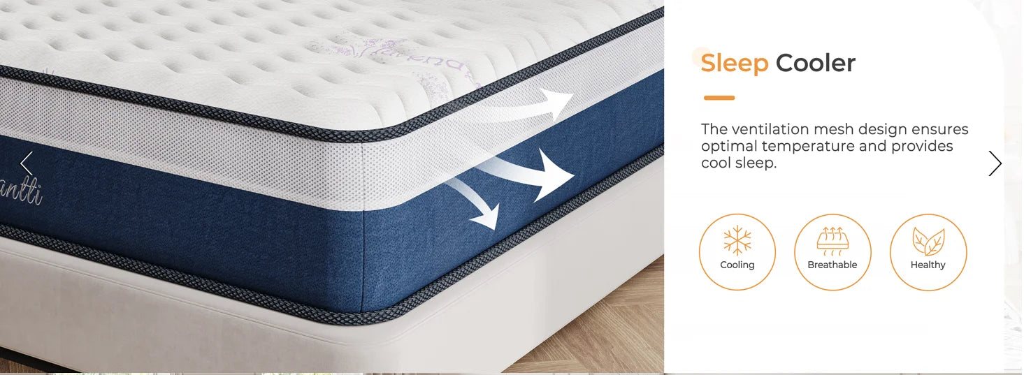 1.Mattress: Romantic 3 zoned lavender stretch knit cover with innovative polyester mesh on side perfectly contours to your body, allows for superior airflow and distributes body heat away for ultimate restfulness