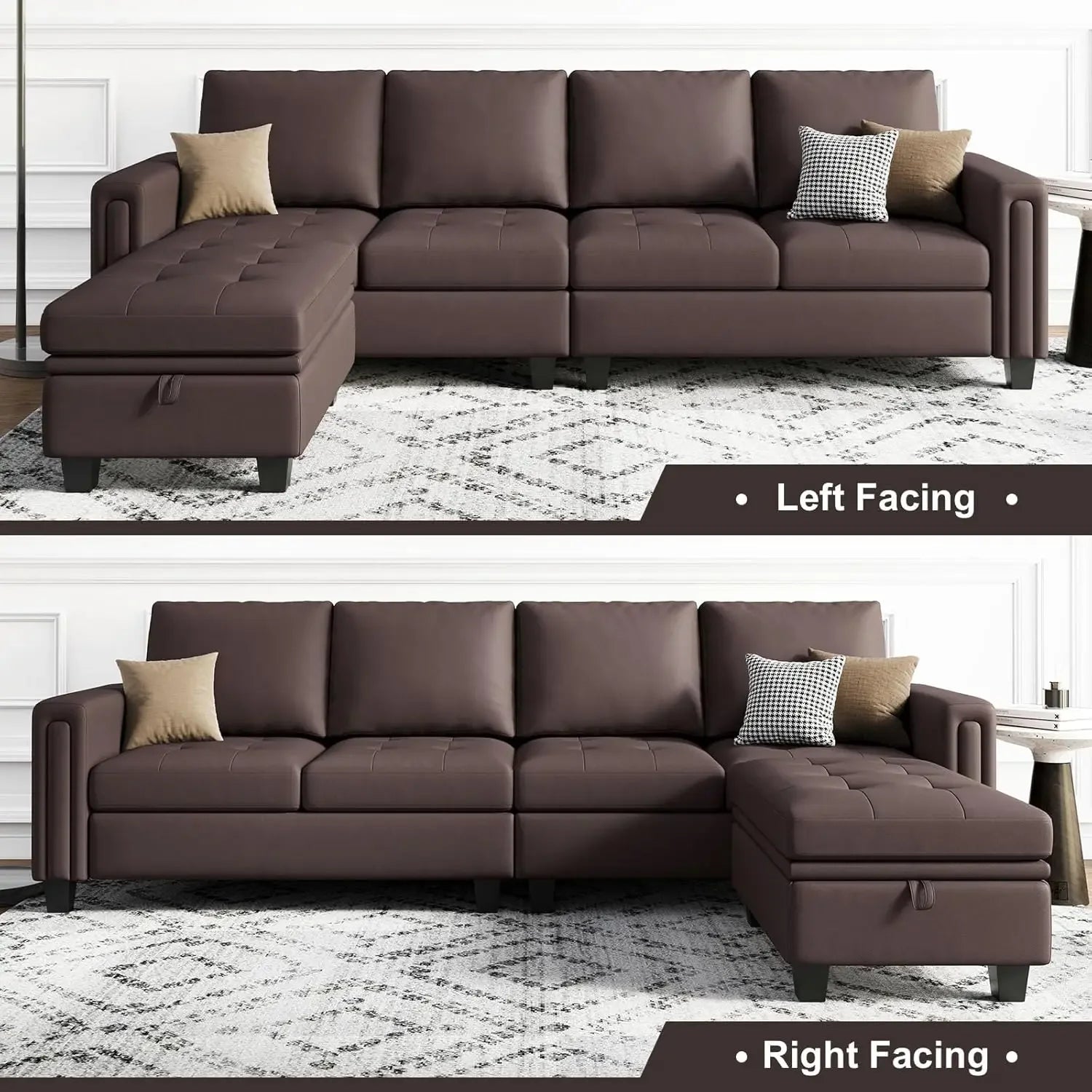 Faux Leather Convertible Sectional Sofa Couch L Shaped Couch Sofa With Reversible Chaise Leather Corner Sectional 4 Seat Sofa With Storage Ottoman Brown