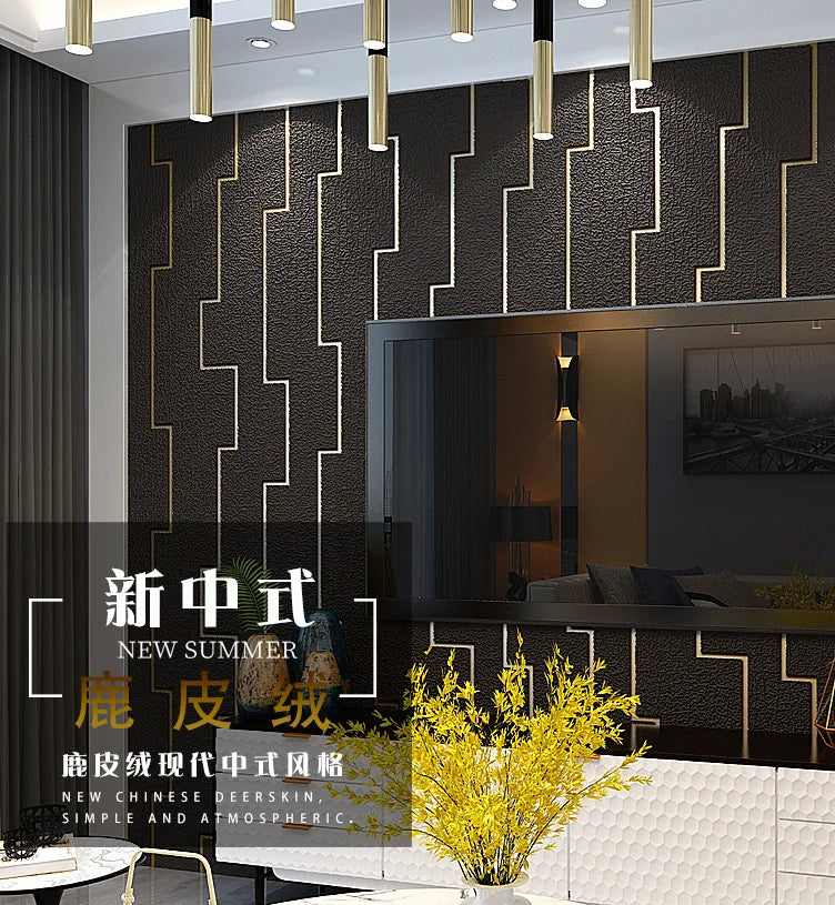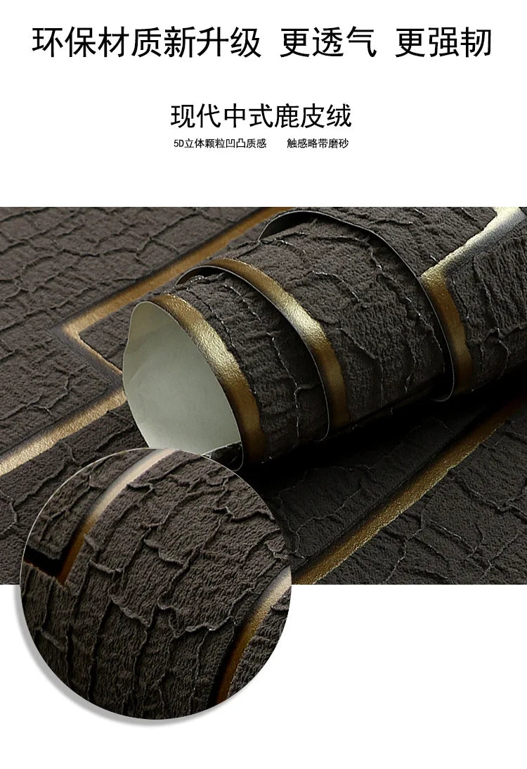 现代中式深色鹿皮绒墙纸咖啡色5D立体加厚电视背景墙客厅简约壁纸