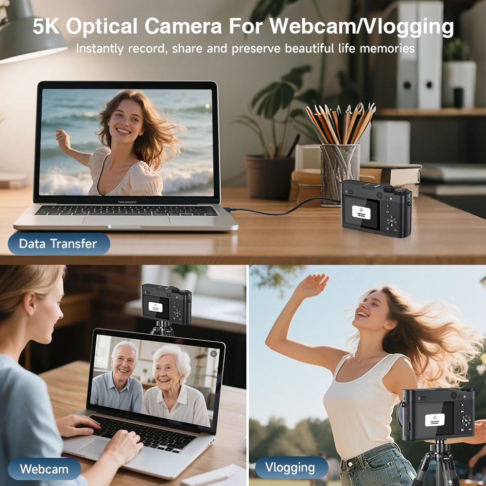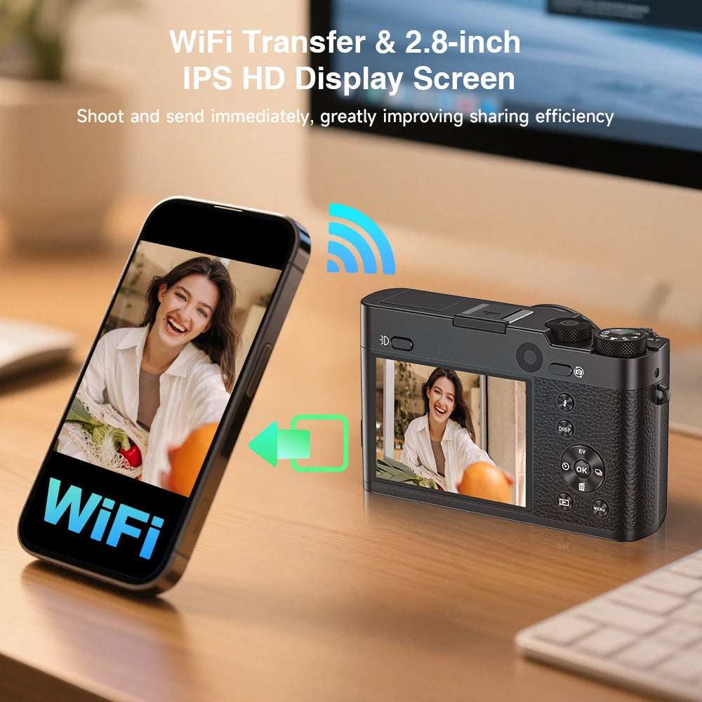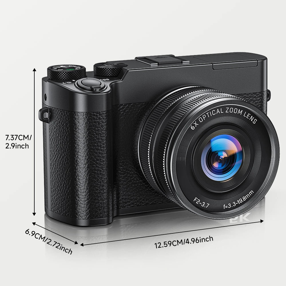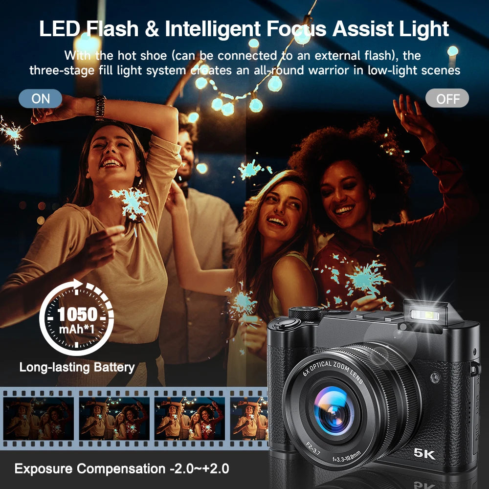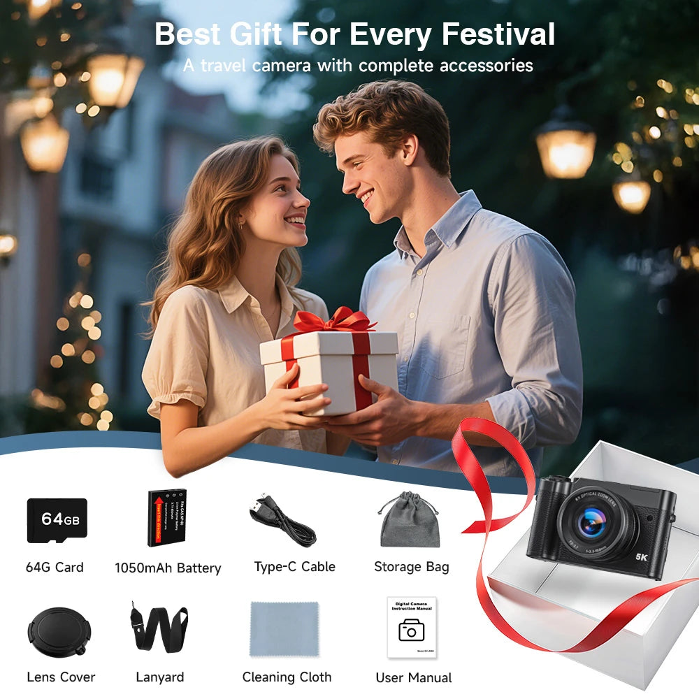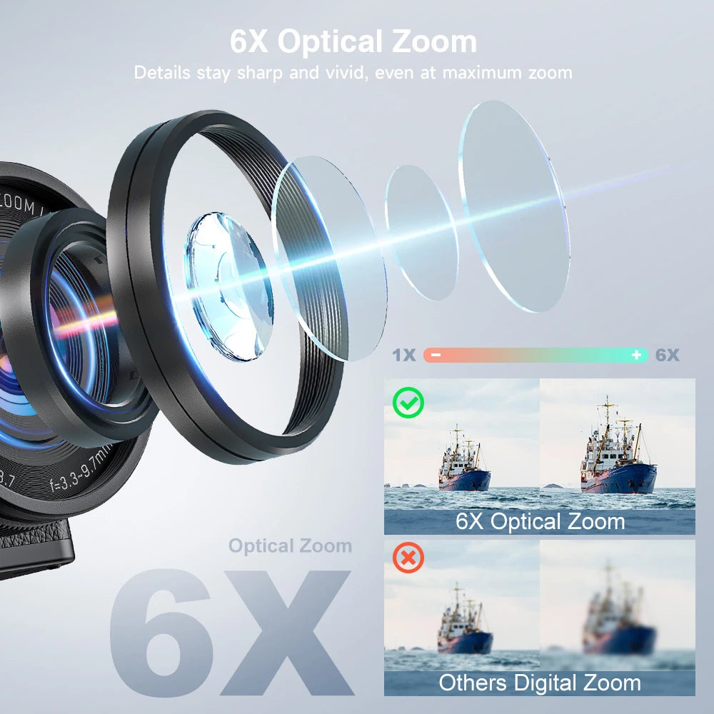 Digital Camera, 6X Optical Zoom & WiFi, 5K 30FPS 64MP Vlogging Camera, Rear & Front Cameras for Photography and Video, 64GB Card