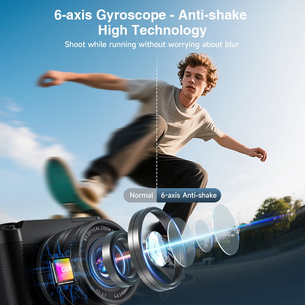 6-AXIS GYRO ANTI-SHAKE BLACK TECHNOLOGY - Shoot while running without fear of blur. The 6-axis gyroscope and electronic anti-shake increase the stability of the images taken during exercise by 60%. Travel bloggers can also explain while walking, and the video is as smooth as using a stabilizer, freeing your hands. The focus assist light helps you quickly lock the focus at night, and refuses the bad experience of "focusing for 10 seconds for night photos".