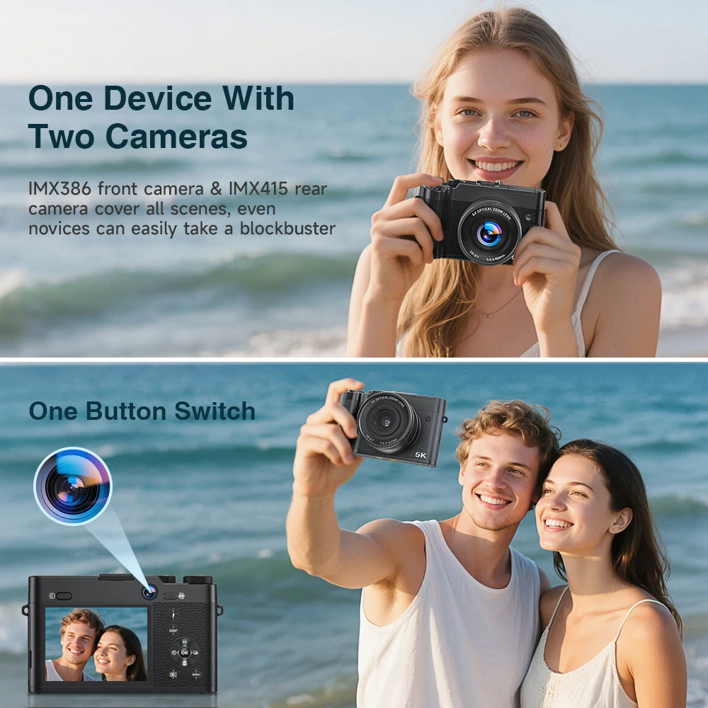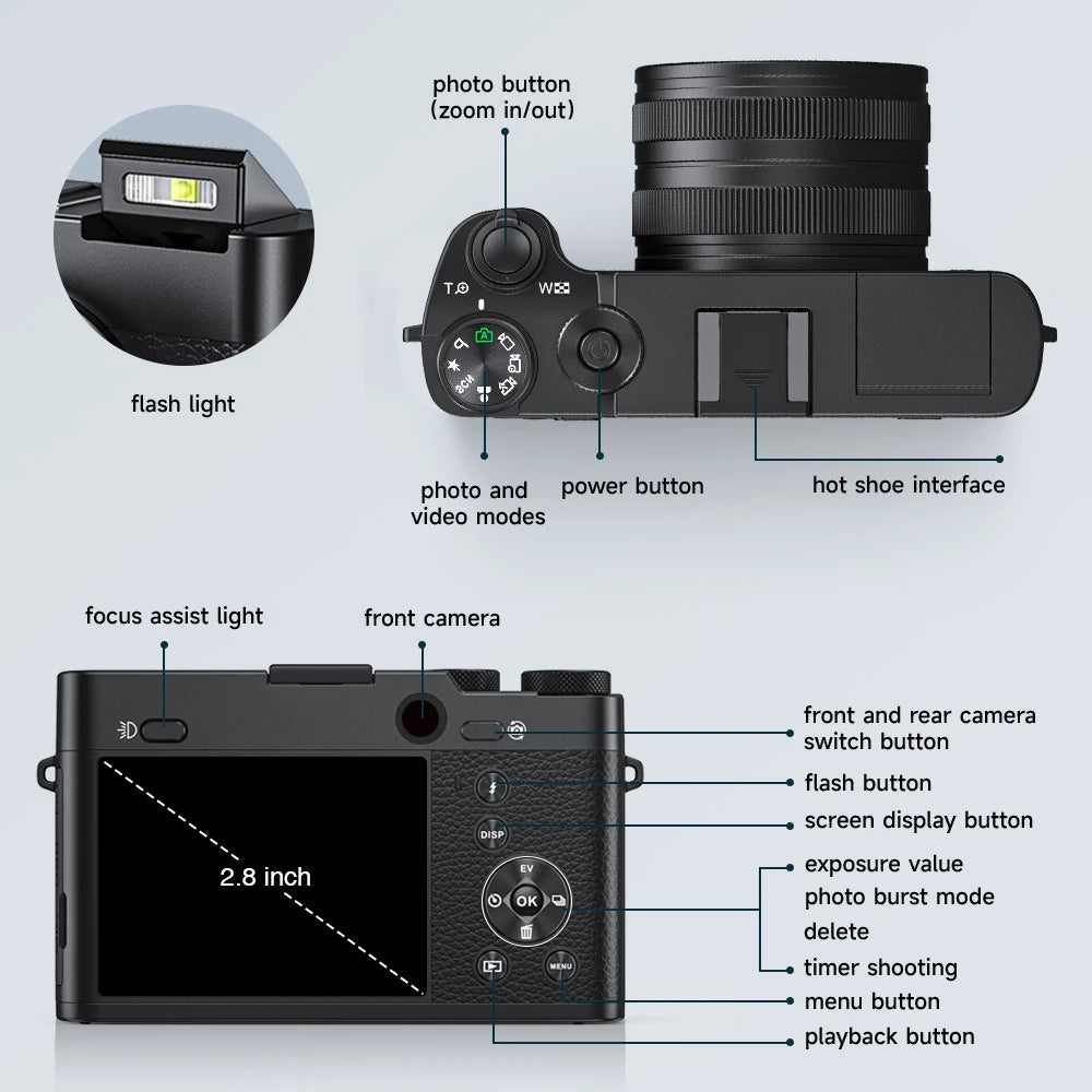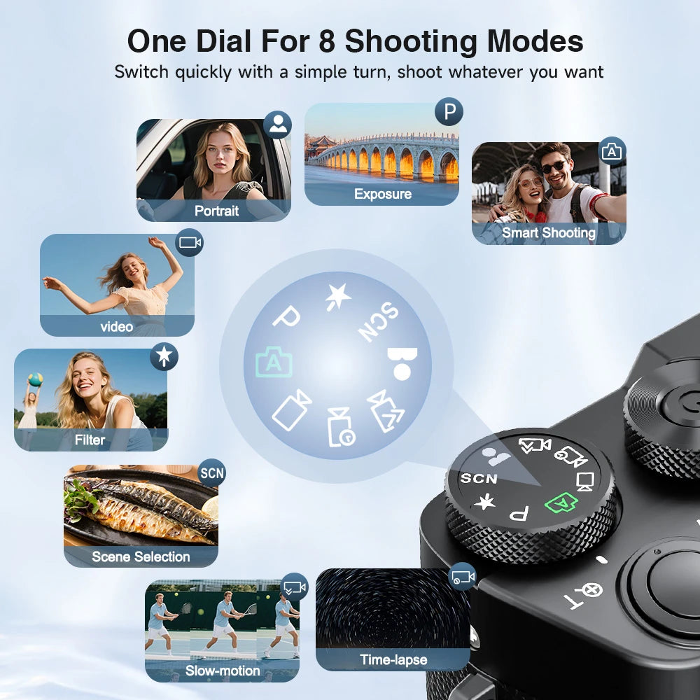 5K 64MP ULTRA HD CREATION STATION - 5K video and 64MP image professional quality equipped with a 2.8-inch IPS HD display screen. 5K video captures the sizzling oily shine of ingredients when frying and grilling, and the texture can still be seen after zooming in. 64MP ultra-clear mode can be used to shoot close-ups of portraits. Automatically optimize light/color, and you can post the photos directly from your travels, saving time for photo editing.