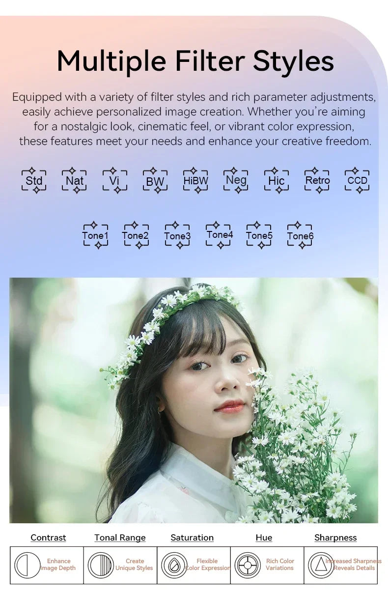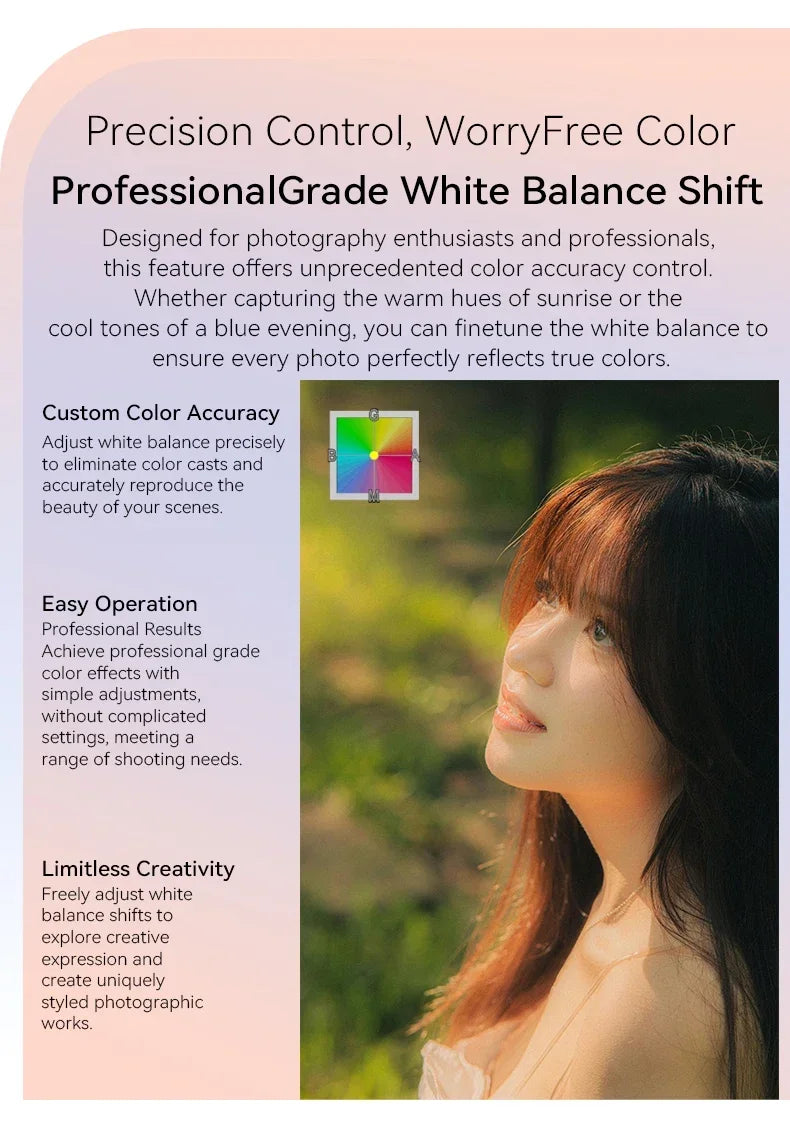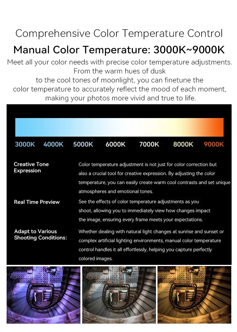 White Balance: Auto/ Daylight / cloudy /Tungsten / Fluorescent (H) / Fluorescent (L) / custom color temperature