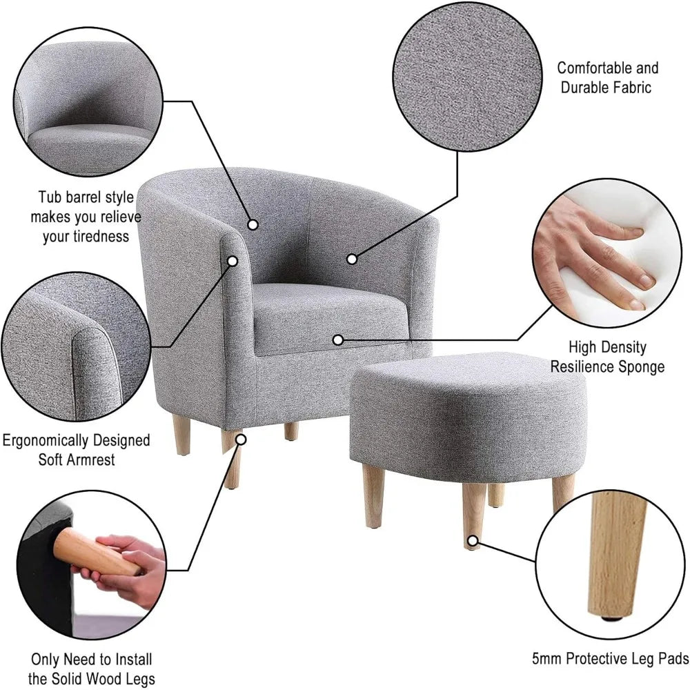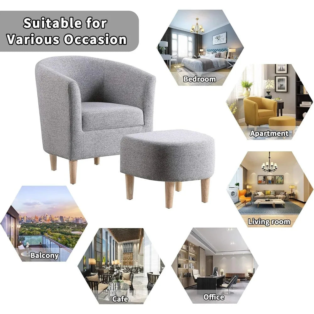 - Comfortable Stylish Barrel Chair with Ottoman: modern comfy accent chair with tub barrel style backrest makes you relieve your tiredness, makes a perfect addition to your living room, bedroom, den, recreation area, guestroom, small spaces apartment, office or studio