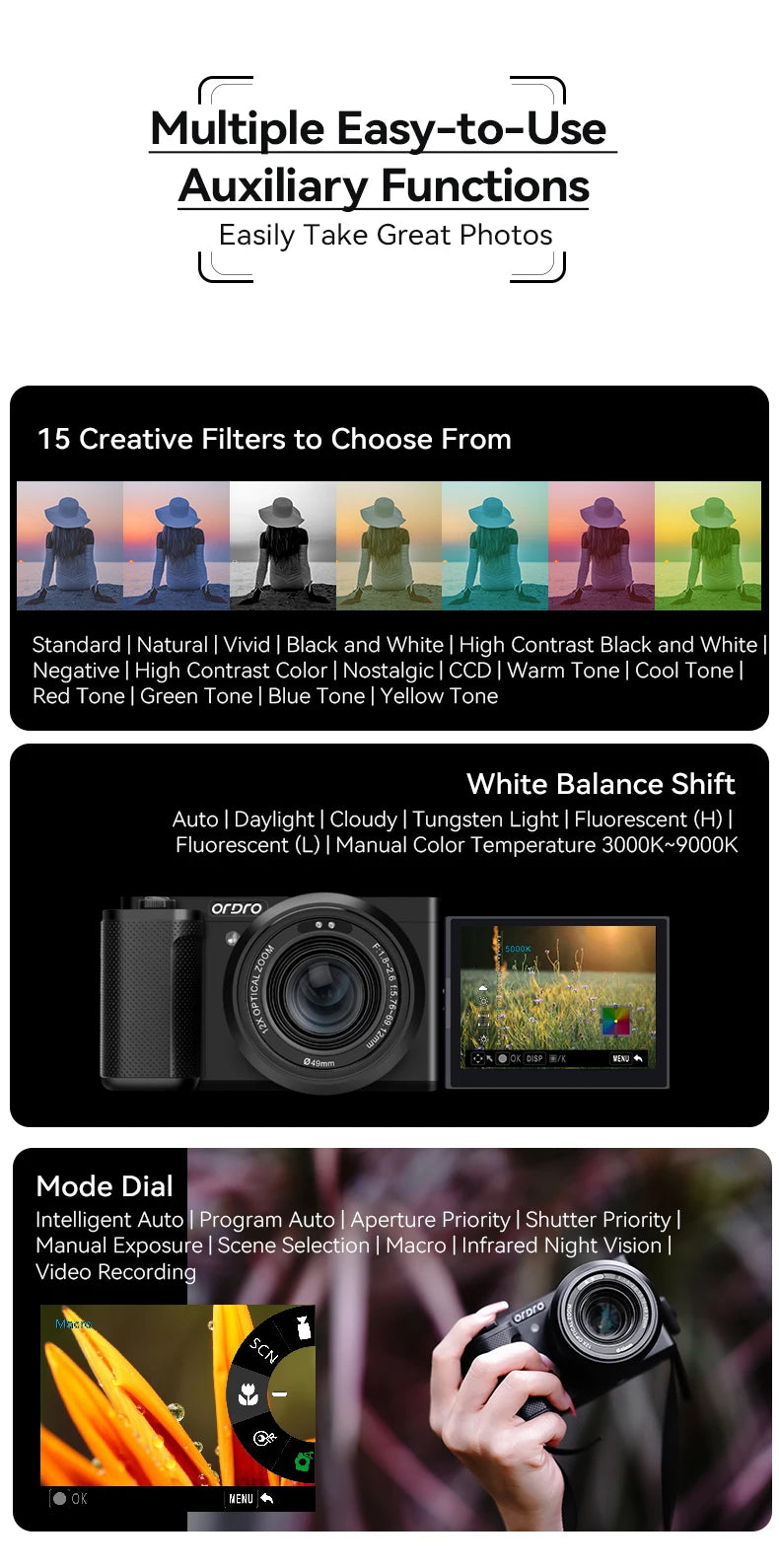 ORDRO G730 Vlog Digital Compact Camera 4K 60FPS IR Night Vision 12X Optical Zoom Auto Manual Focus Video Camcorder Photography