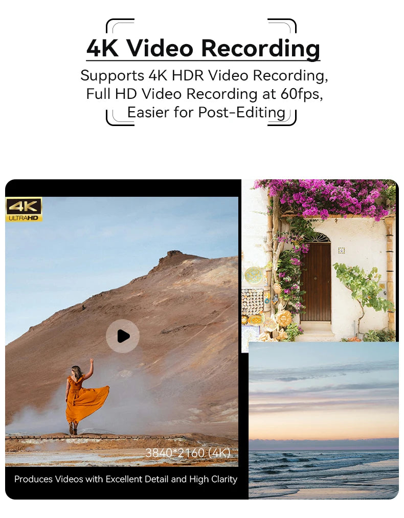 Memory Card: External SD card (Max: 512GB) (Card speed requires U3/Class30/V30 or higher)