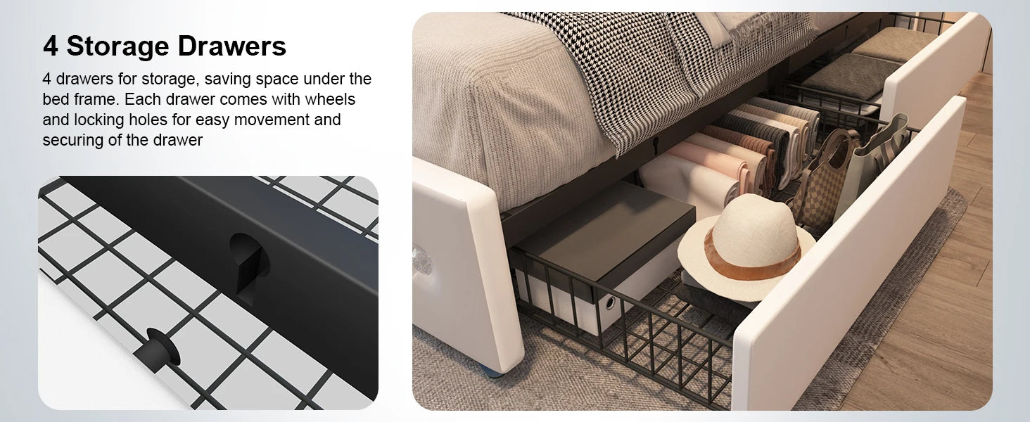 4 drawers for storage, saving space under thebed frame. Each drawer comes with wheels and locking holes for easy movement andsecuring of the drawer.Keep your room fresh and clean, and don't worry about clutter.