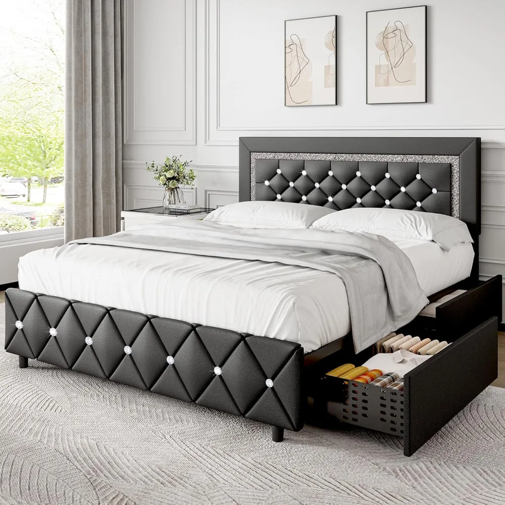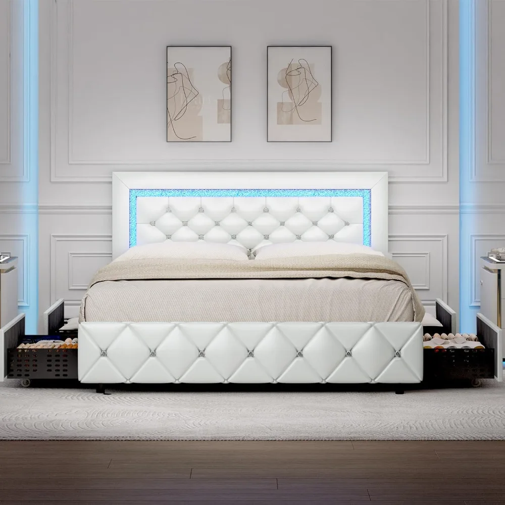 Queen Size Bed Frame with LED Lights, Upholstered Bed Frame with 4 Storage Drawers, with Diamond Headboard and Footboard