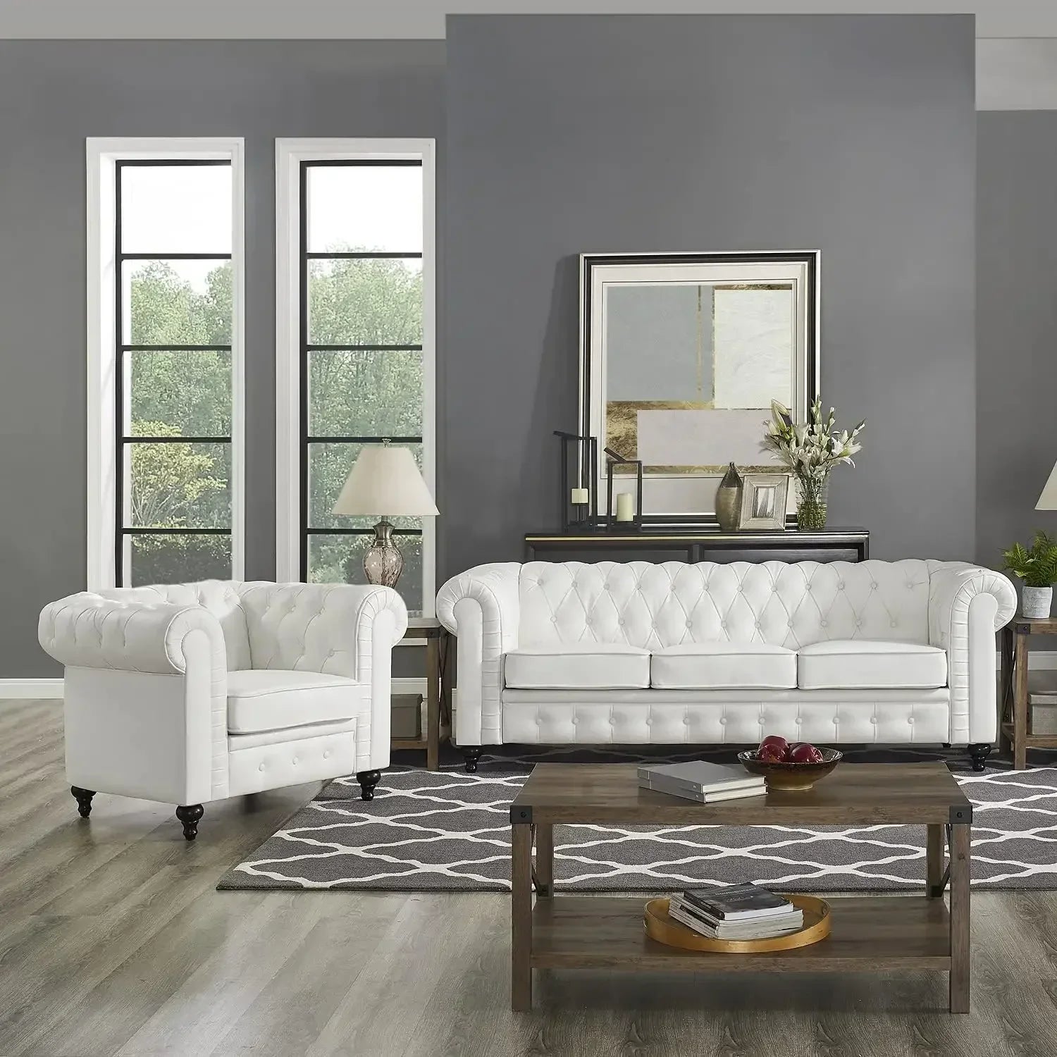 - MODERN CHESTERFIELD LOUNGE: Create a lounge-worthy living room with this modernized Chesterfield sofa. Rich Gray or White leather upholstery, along with a high back and arms, the Faux Leather Sofa just perfect to sit back and read a good book or take a quick power nap.