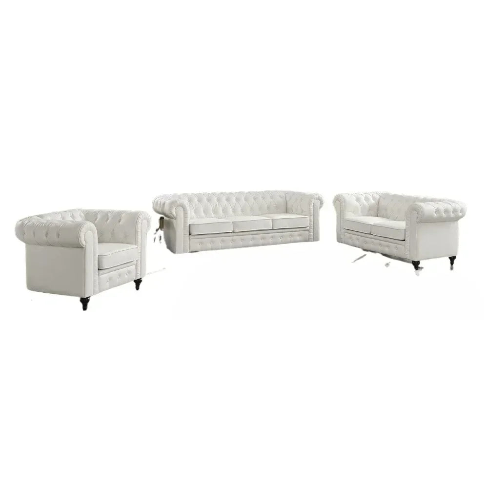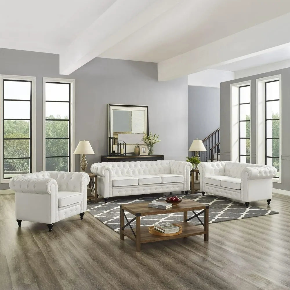 - ULTIMATE COMFORT IN YOUR SPACE: Made with High quality Faux Leather High resiliency foam, the Chesterfied Faux Leather Couch sofa set will be the epitome of comfort in your hoeme. No-Sag base and Tufted arm and back support means everyone is comfortable.