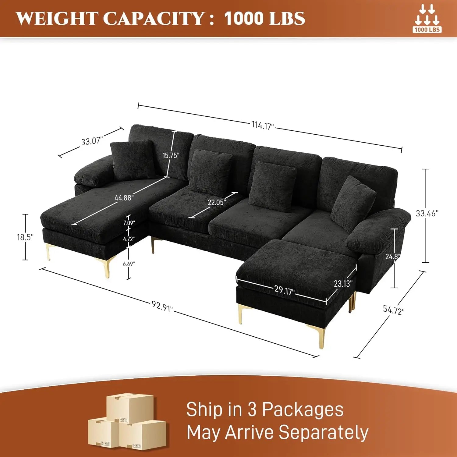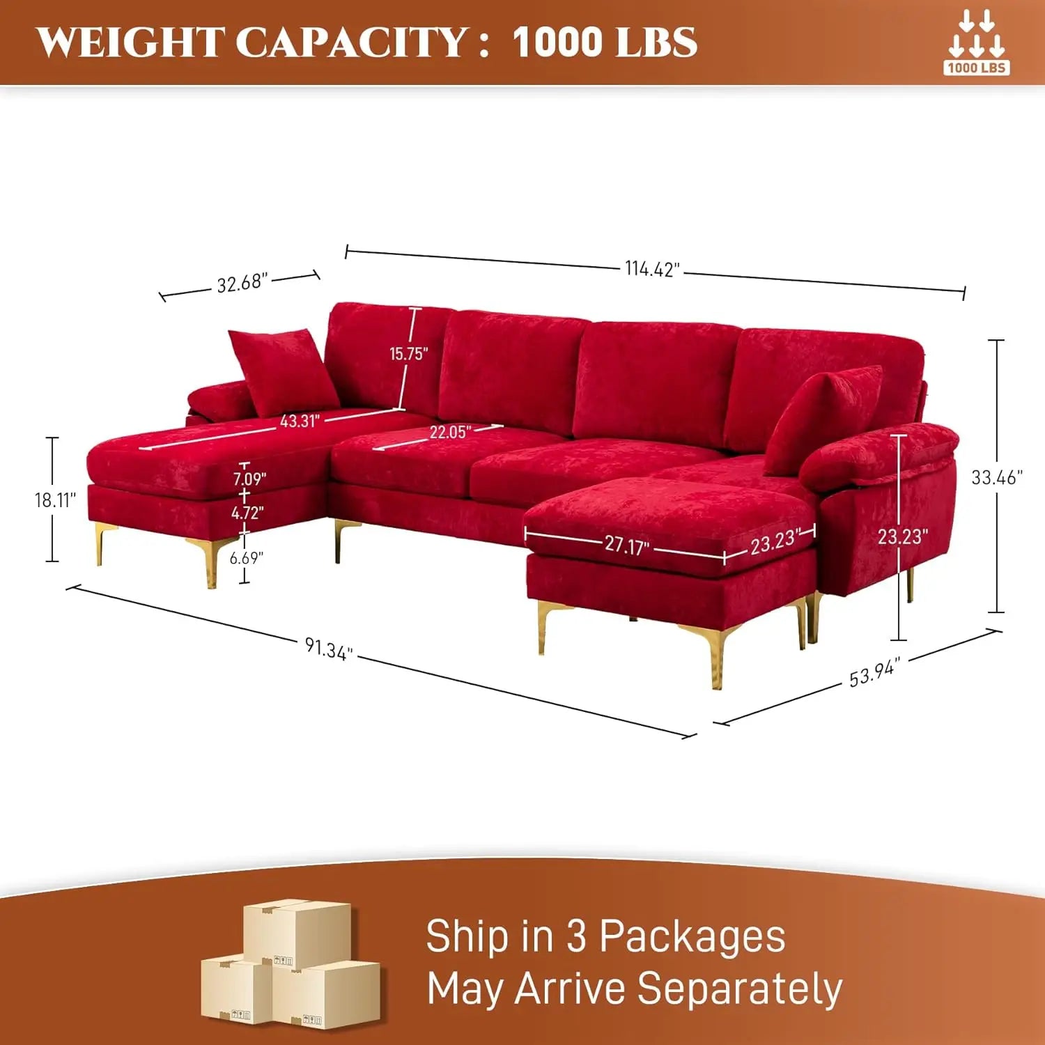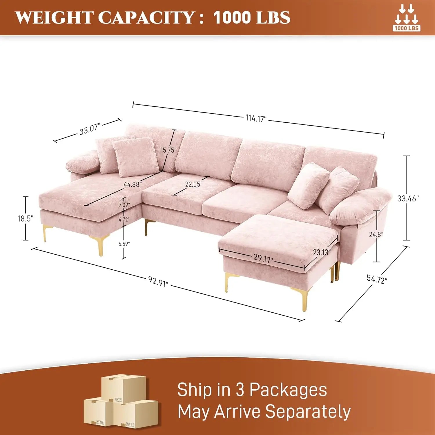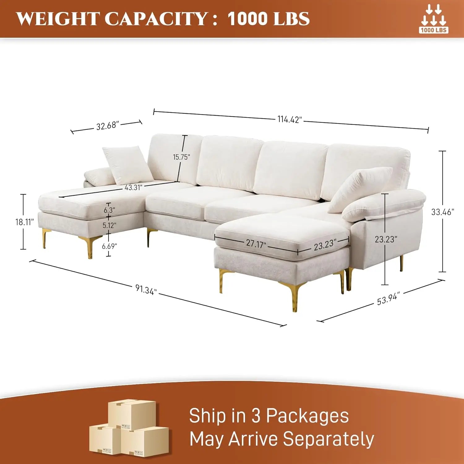 - 【3 Packages】Overall Size: 114.17"W x 54.72"D x 33.46"H. Following the instruction manual step by step, you can install the U-shaped modular sofa sleeper easily. Set of sofas shipped in three boxes may arrive separately within a few days. Please feel free to contact us if you have any questions.