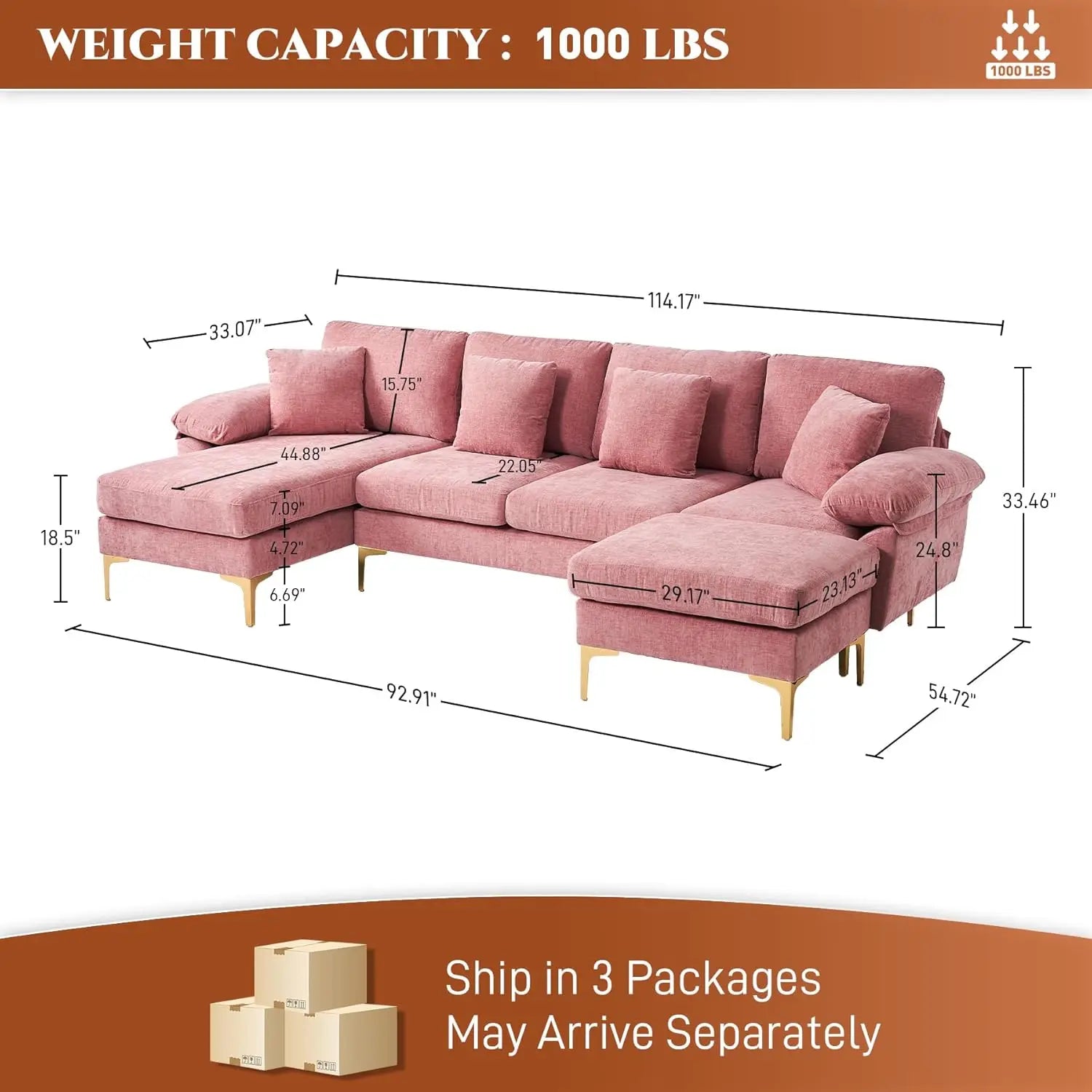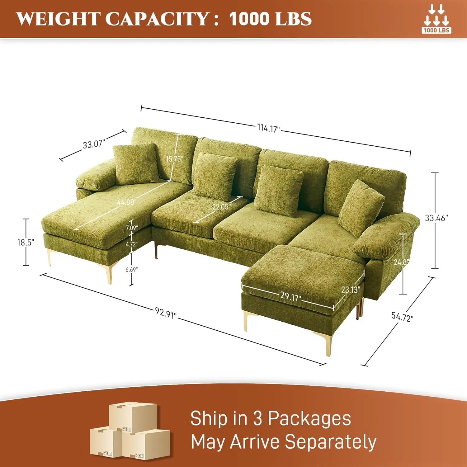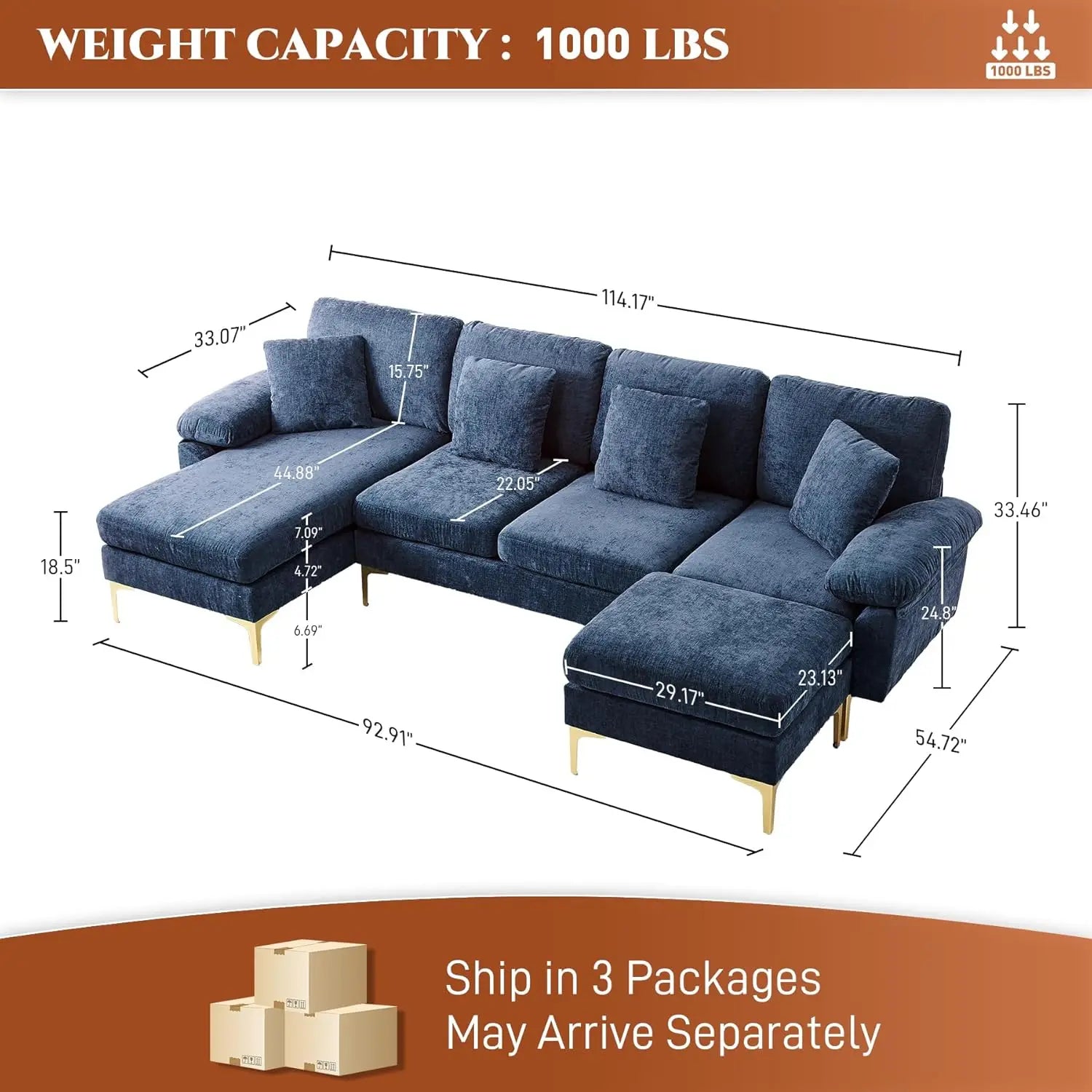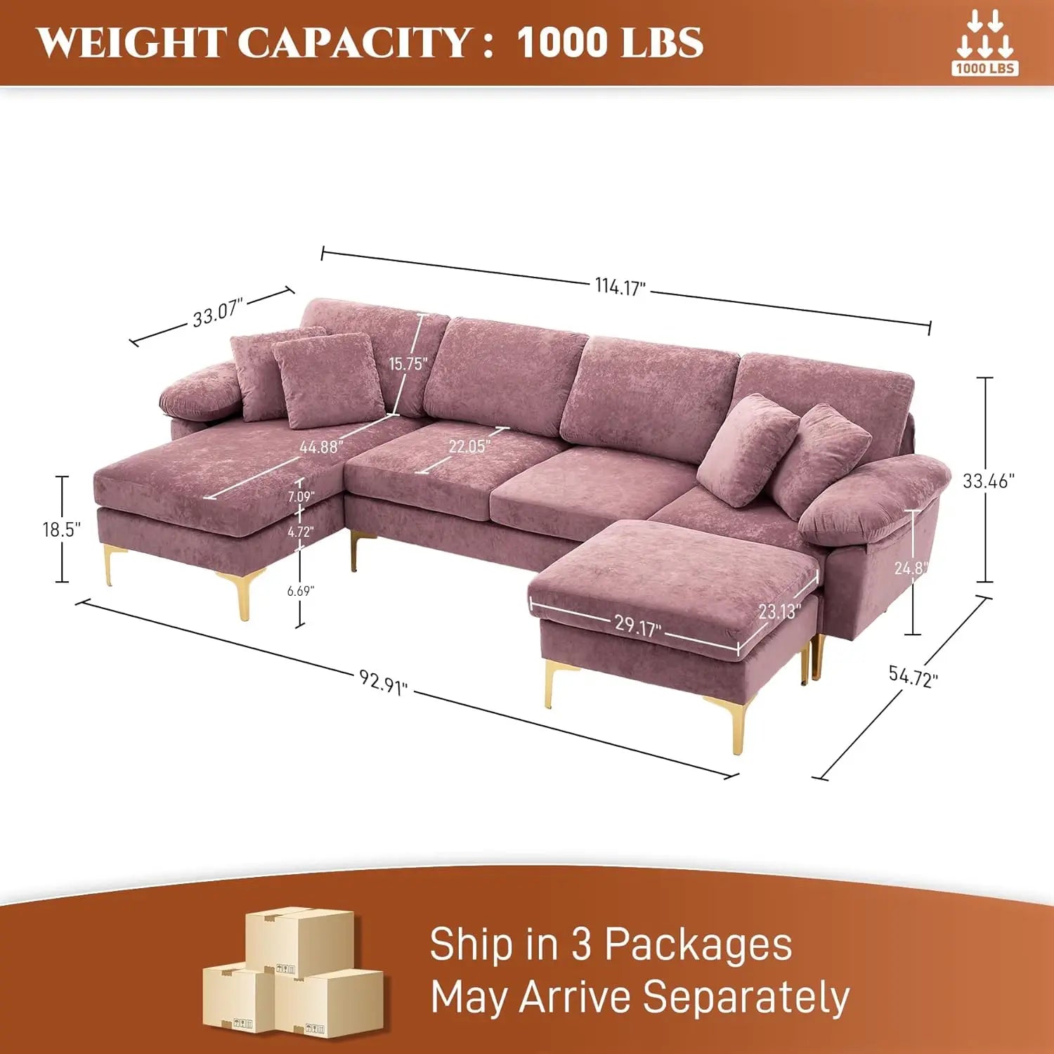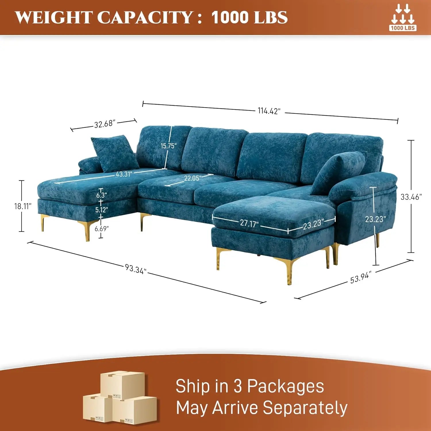 - 【3 Packages】Overall Size: 114.17"W x 54.72"D x 33.46"H. Following the instruction manual step by step, you can install the U-shaped modular sofa sleeper easily. Set of sofas shipped in three boxes may arrive separately within a few days. Please feel free to contact us if you have any questions.